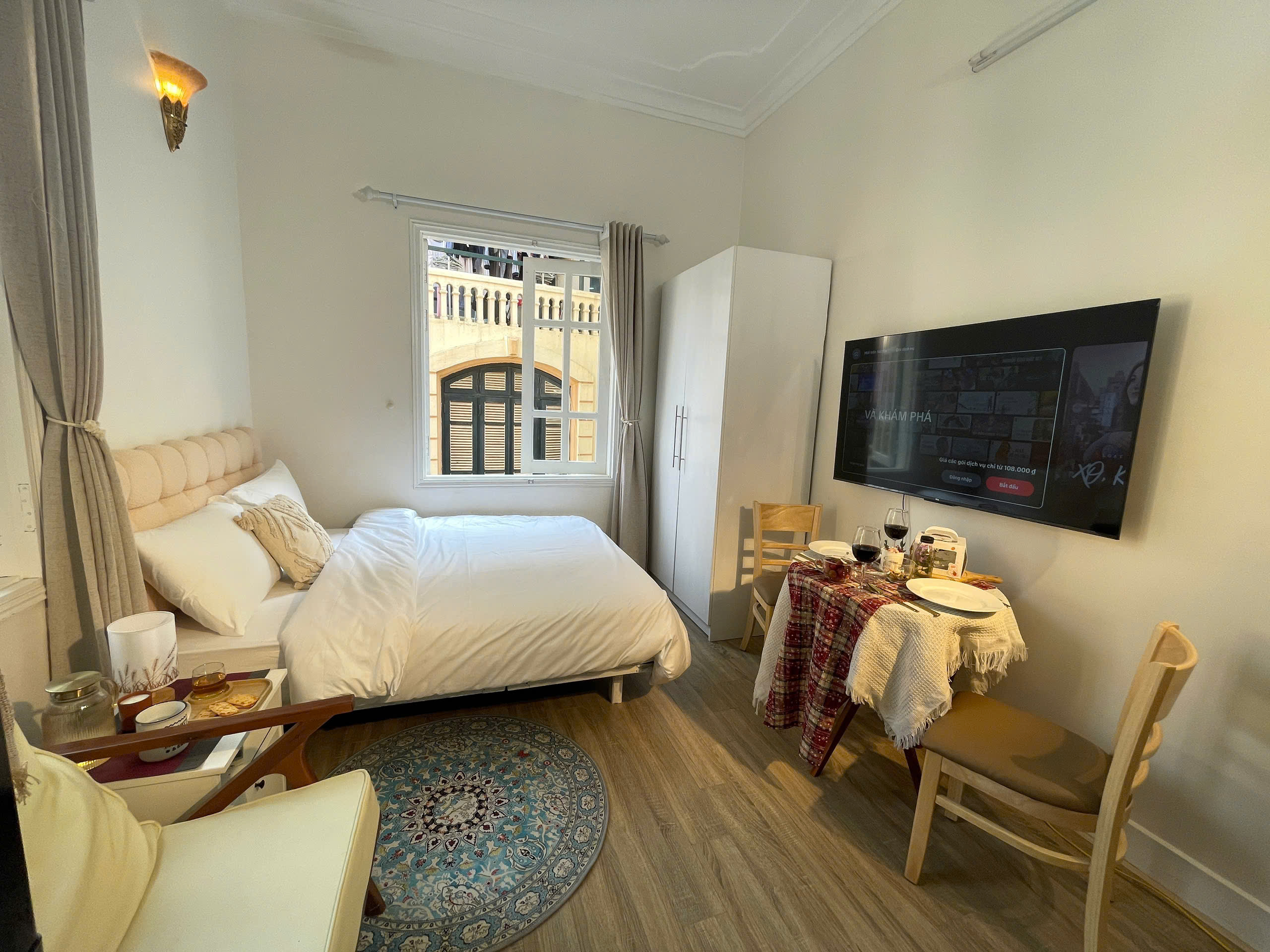 Căn hộ còn sở hữu một góc thư giãn lý tưởng với ghế bành thoải mái và thảm trải sàn họa tiết bắt mắt, nơi bạn có thể nhâm nhi tách trà hay đọc sách bên khung cửa sổ tràn ngập ánh sáng tự nhiên. Đối diện là khu vực ăn uống ấm cúng với bàn ăn nhỏ được trang trí tỉ mỉ, rất thích hợp cho những bữa ăn lãng mạn.