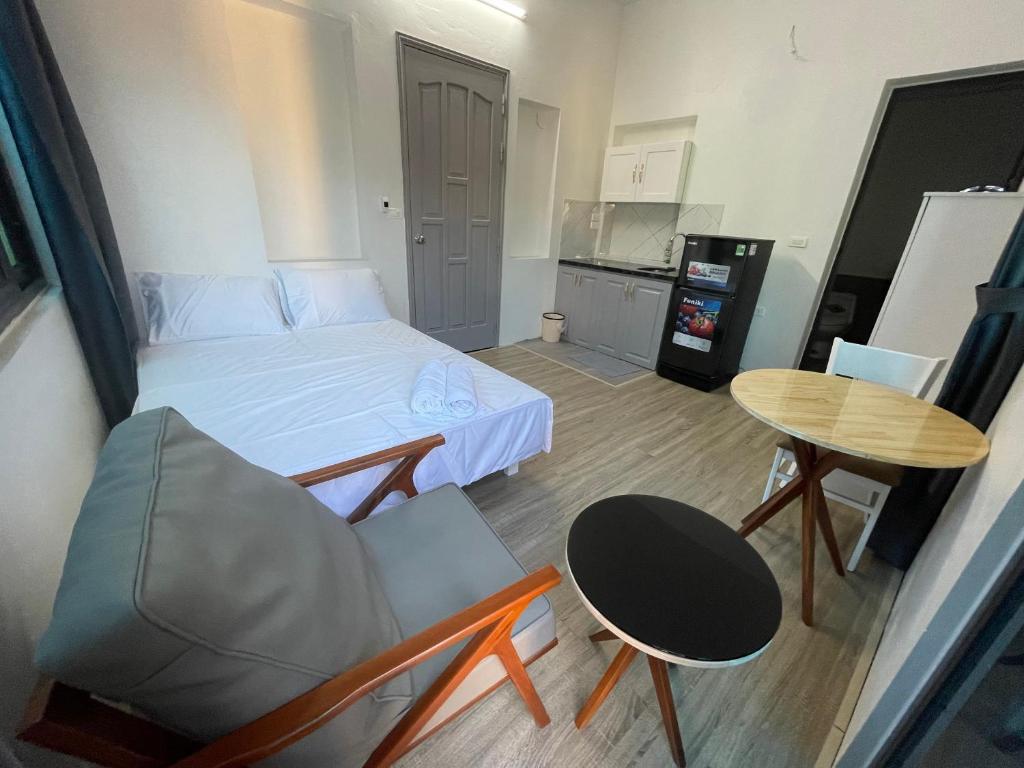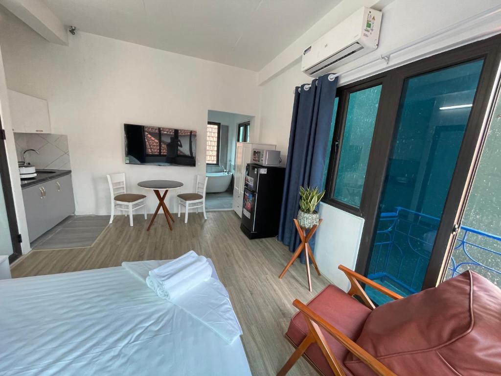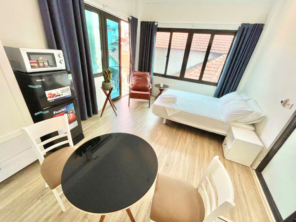 Khu vực bếp nhỏ gọn nhưng đầy đủ tiện ích với bồn rửa, bếp nấu, tủ lạnh Funiki và lò vi sóng, giúp bạn dễ dàng chuẩn bị bữa ăn nhẹ. Bàn ăn nhỏ xinh với hai ghế được đặt ngay gần bếp, tạo không gian ấm cúng cho những bữa ăn tại căn hộ.