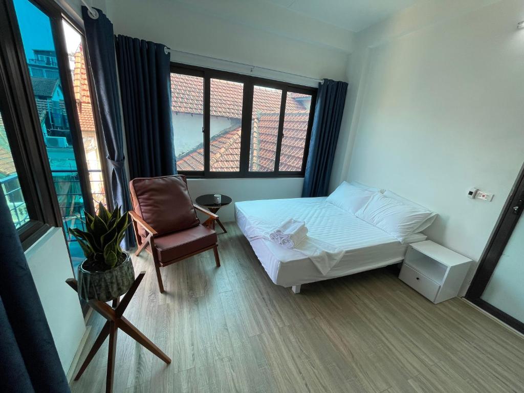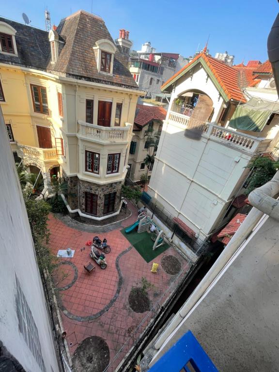 Căn hộ còn sở hữu một góc thư giãn ấm cúng với ghế bành thoải mái và bàn tròn nhỏ, nơi bạn có thể nhâm nhi tách trà, đọc sách hay đơn giản là ngắm nhìn khung cảnh bên ngoài qua những ô cửa sổ rộng lớn. Đặc biệt, căn hộ có ban công riêng với tầm nhìn ra những mái nhà cổ kính và khu vực sân chung xanh mát, mang lại cảm giác bình yên và thư thái.