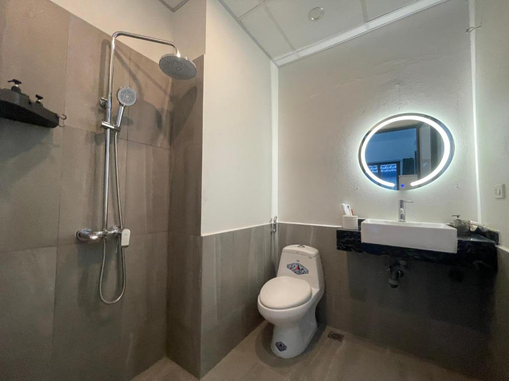 Phòng tắm hiện đại được trang bị vòi sen tắm mưa, bồn rửa mặt vuông vắn và gương tròn có đèn LED phát sáng, mang đến không gian tươi sáng và tiện nghi. Sự kết hợp giữa gạch ốp tường màu xám và trắng tạo nên vẻ đẹp trang nhã.