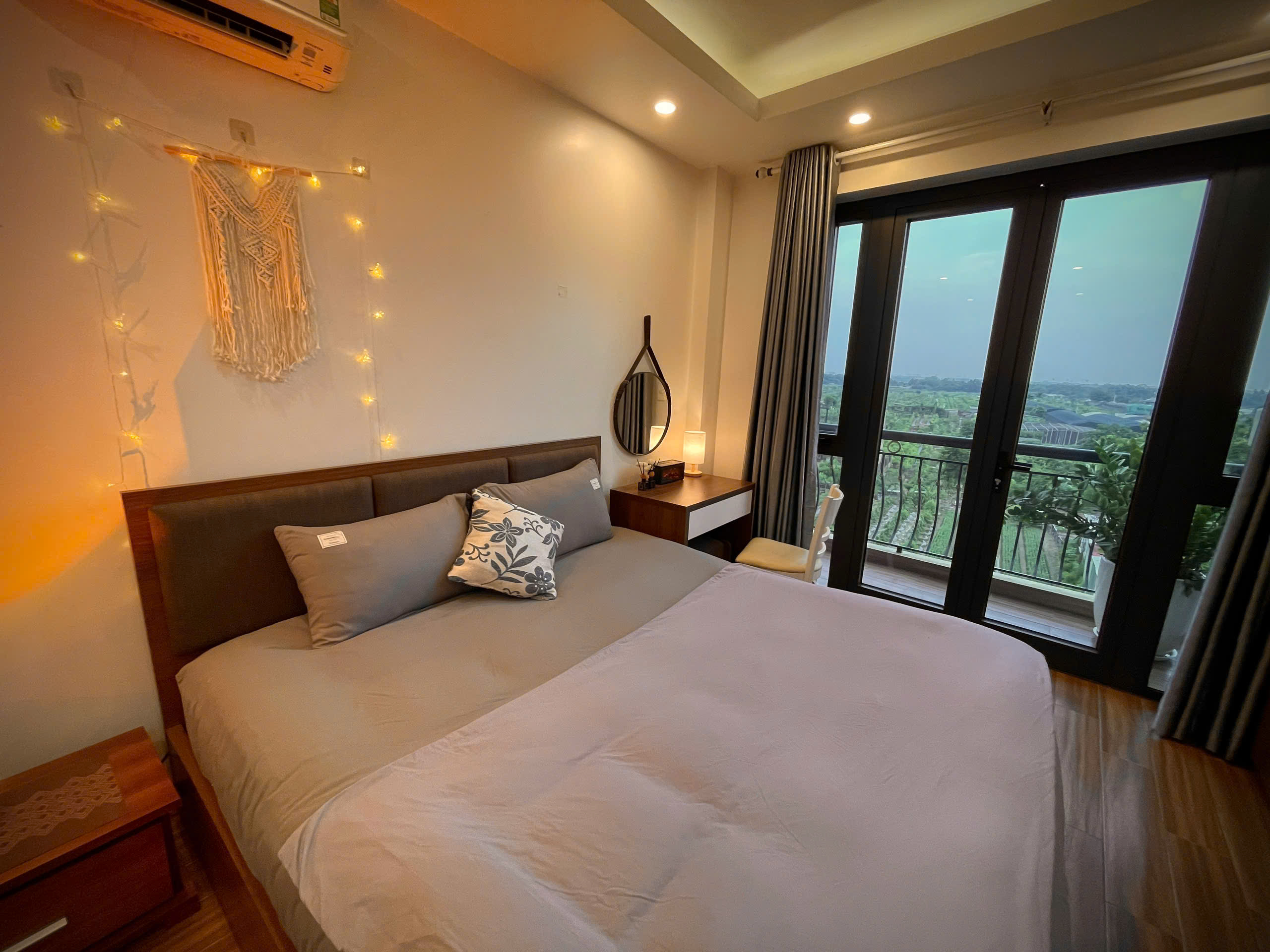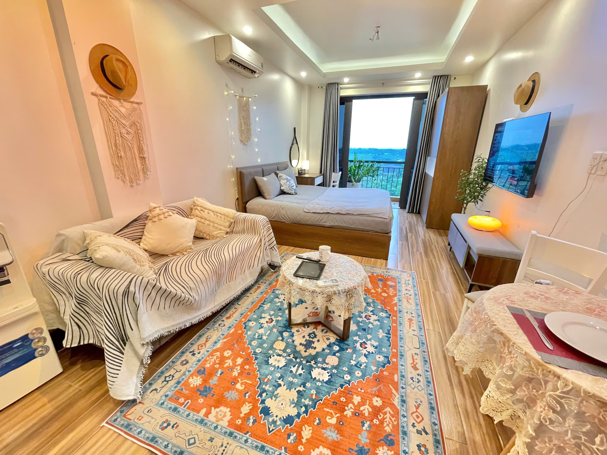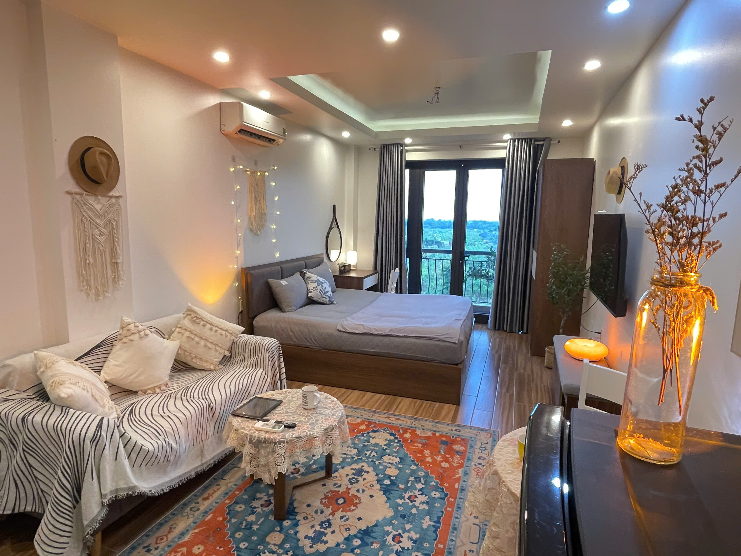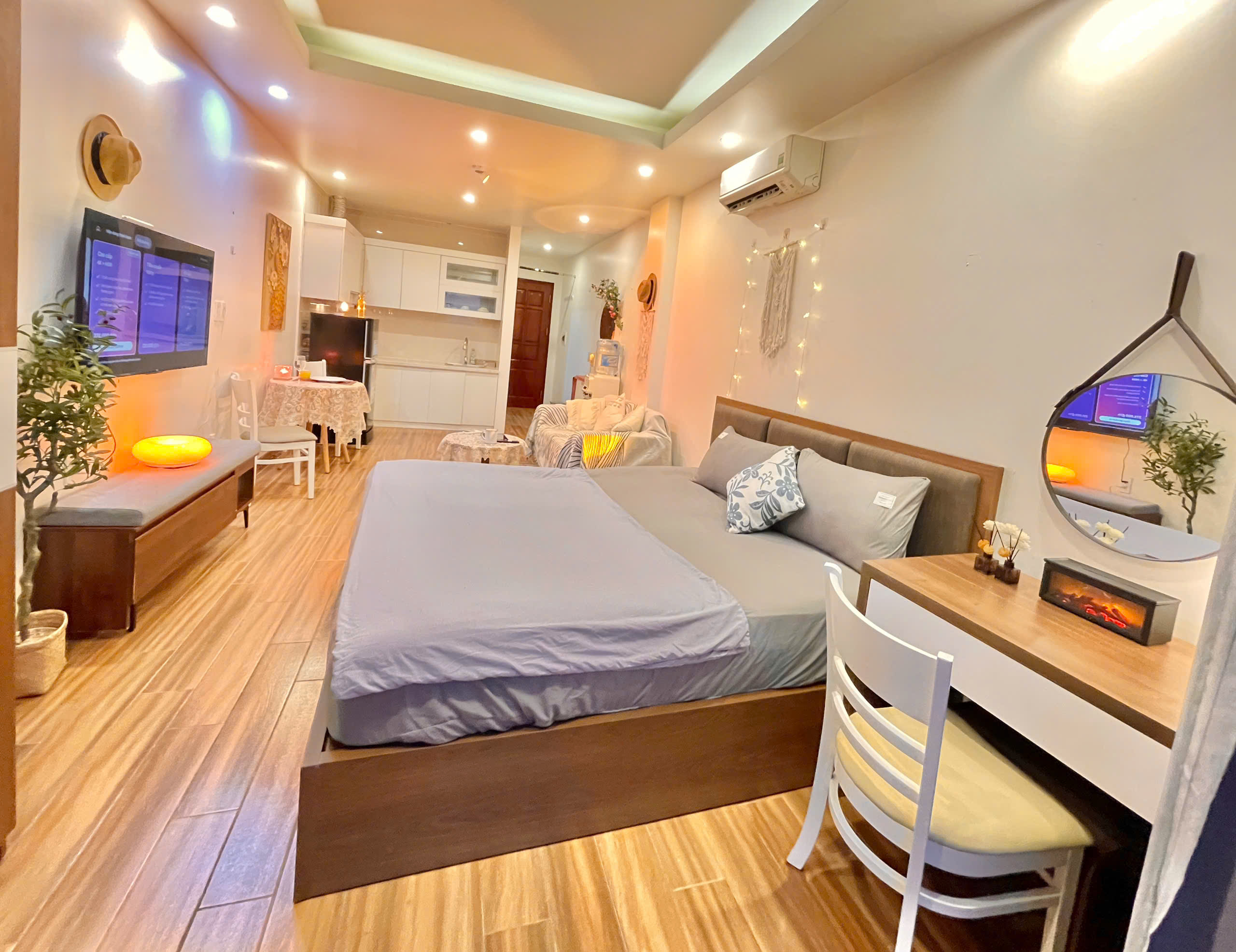 Căn hộ còn được trang bị điều hòa không khí để đảm bảo sự mát mẻ trong mọi điều kiện thời tiết. Các chi tiết trang trí như gương tròn lớn, cây xanh và đồ trang trí macrame tạo nên một không gian sống đầy tính nghệ thuật và ấm cúng.