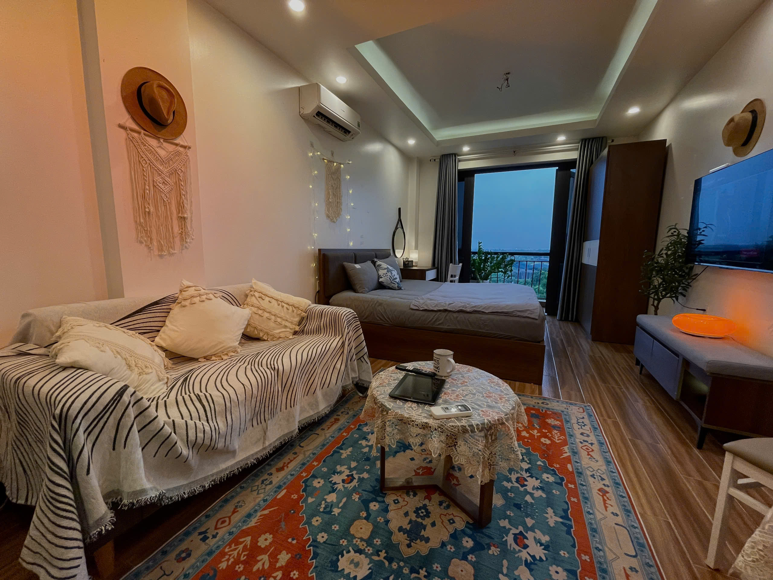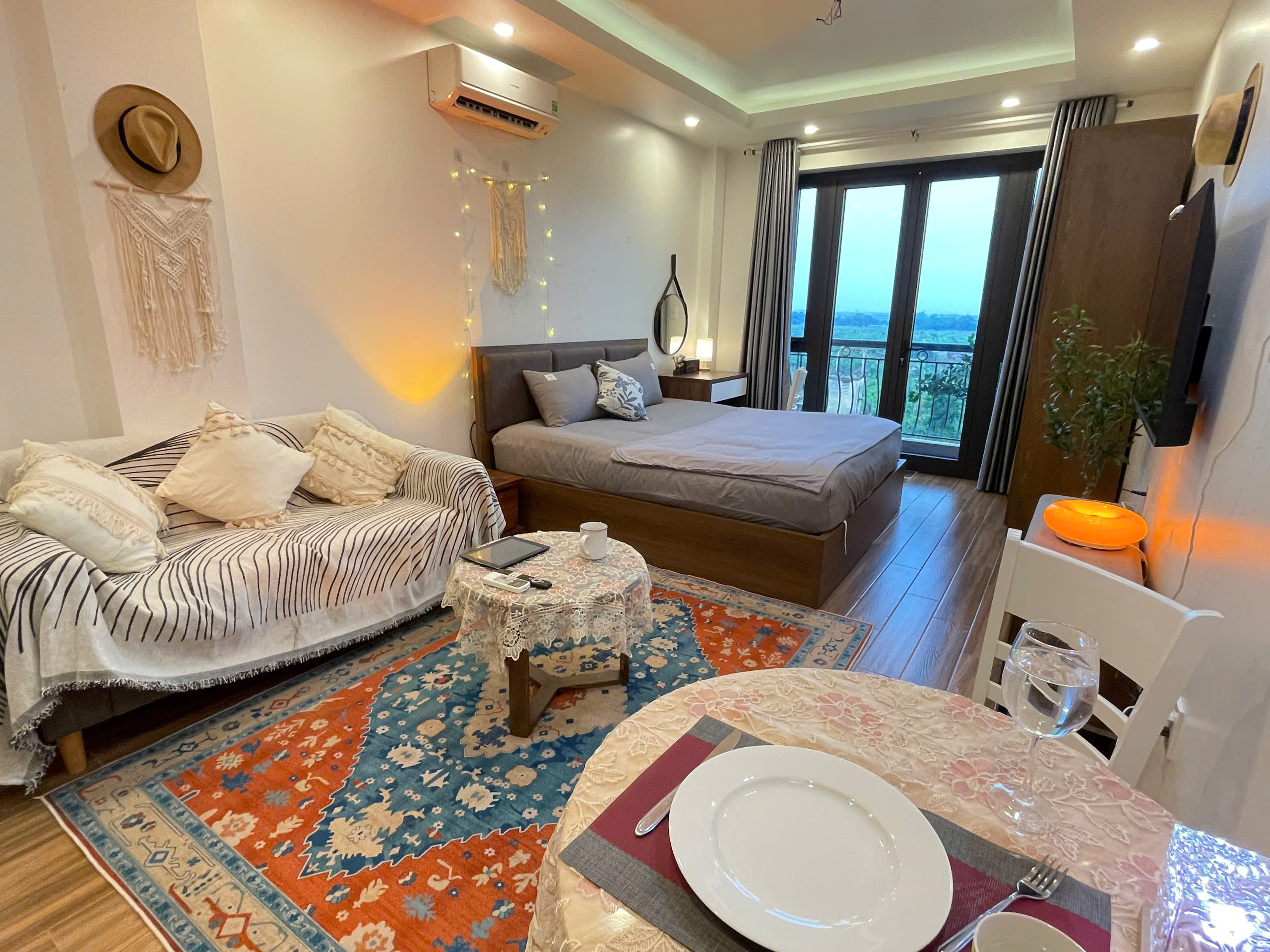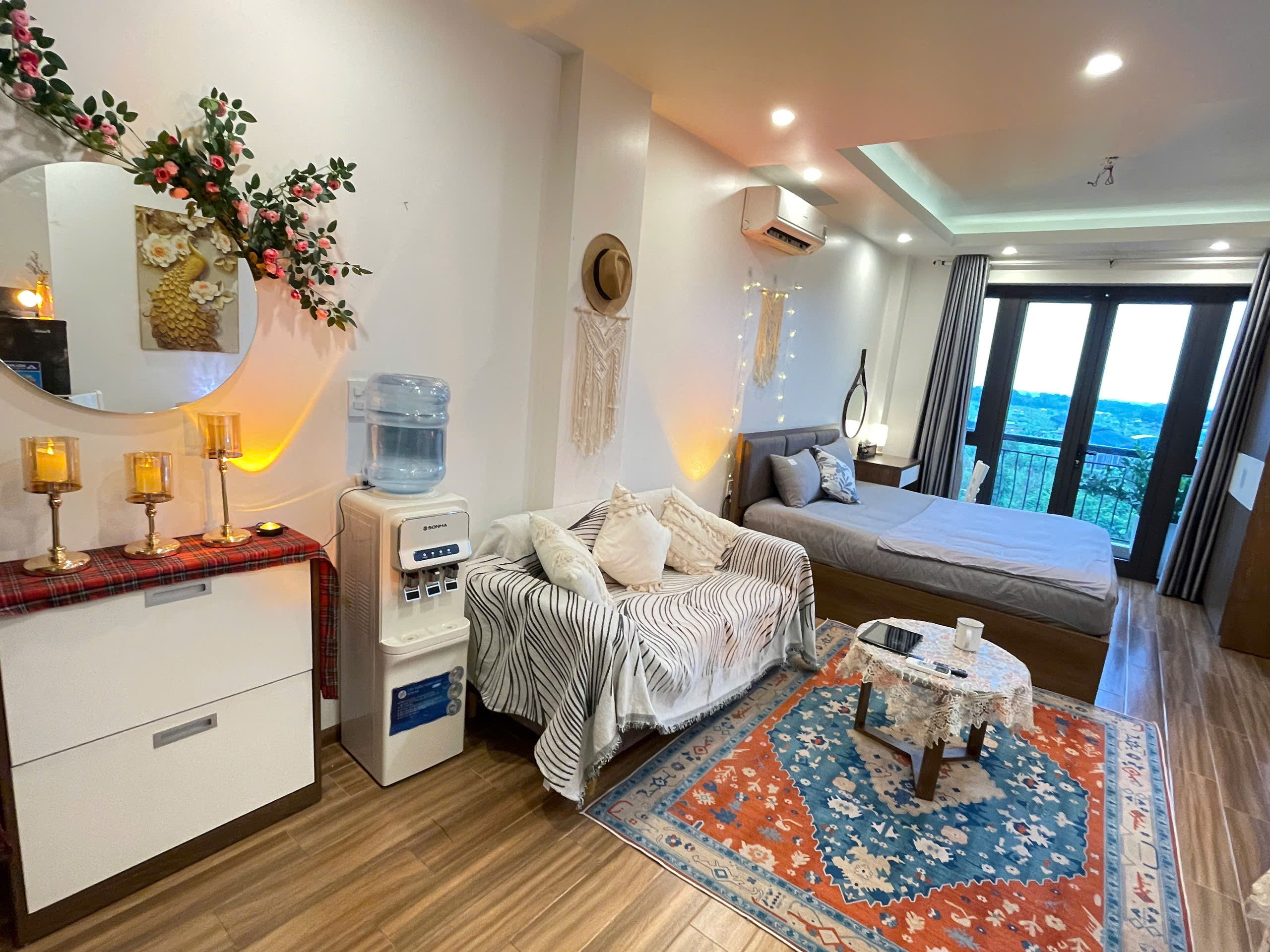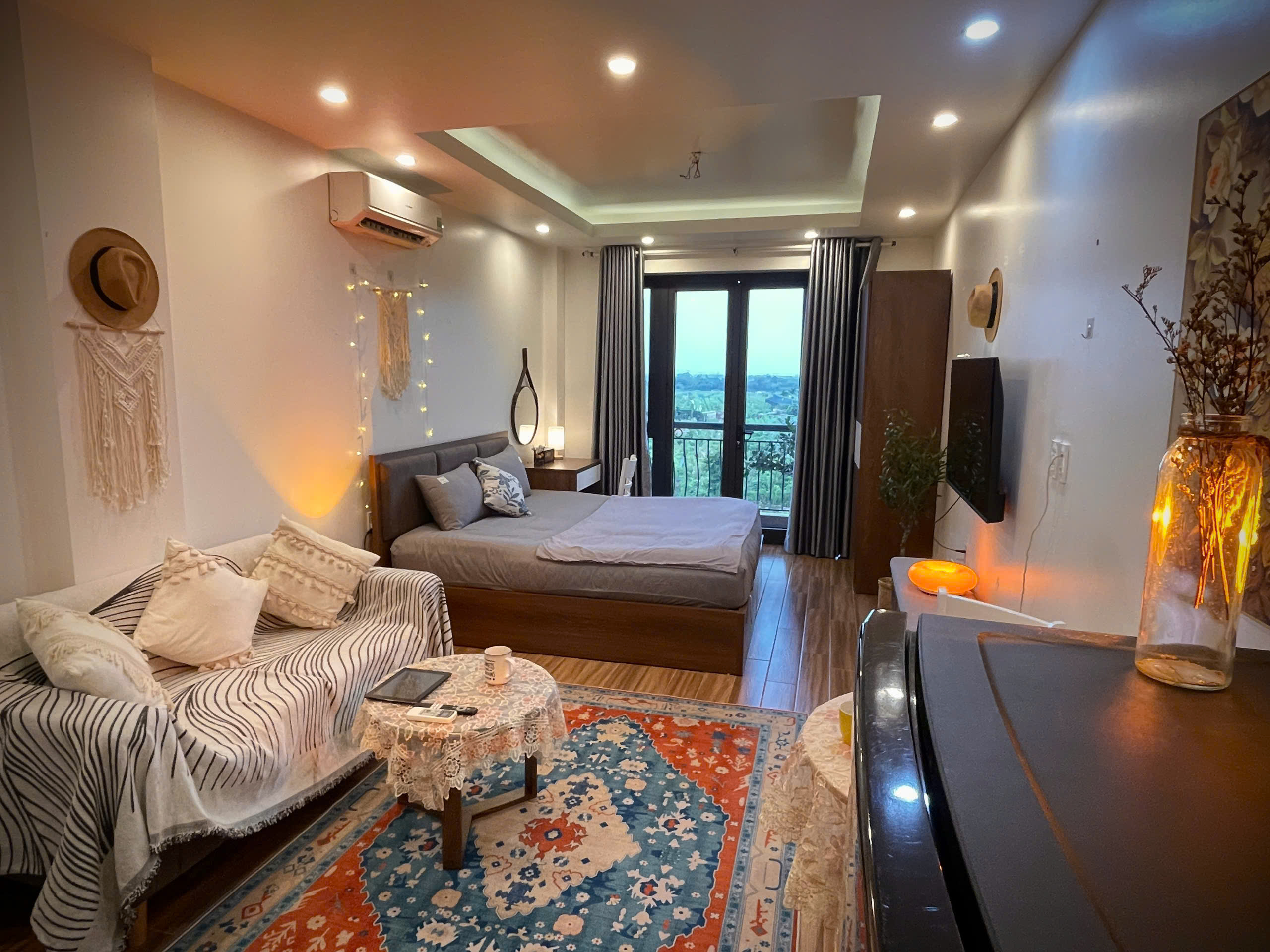 Căn hộ còn được trang bị điều hòa không khí để đảm bảo sự mát mẻ trong mọi điều kiện thời tiết. Các chi tiết trang trí như gương tròn lớn, cây xanh và đồ trang trí macrame tạo nên một không gian sống đầy tính nghệ thuật và ấm cúng.