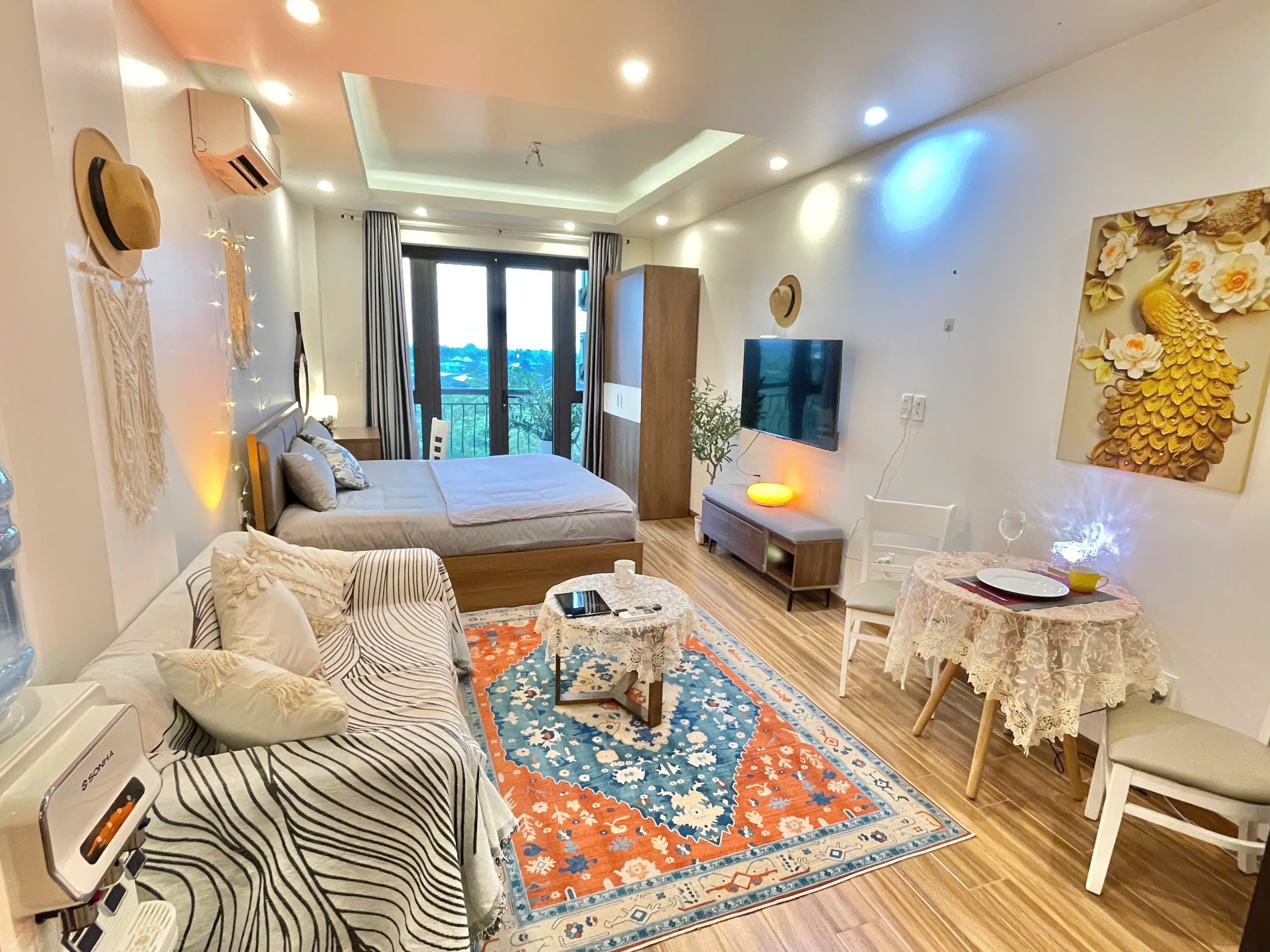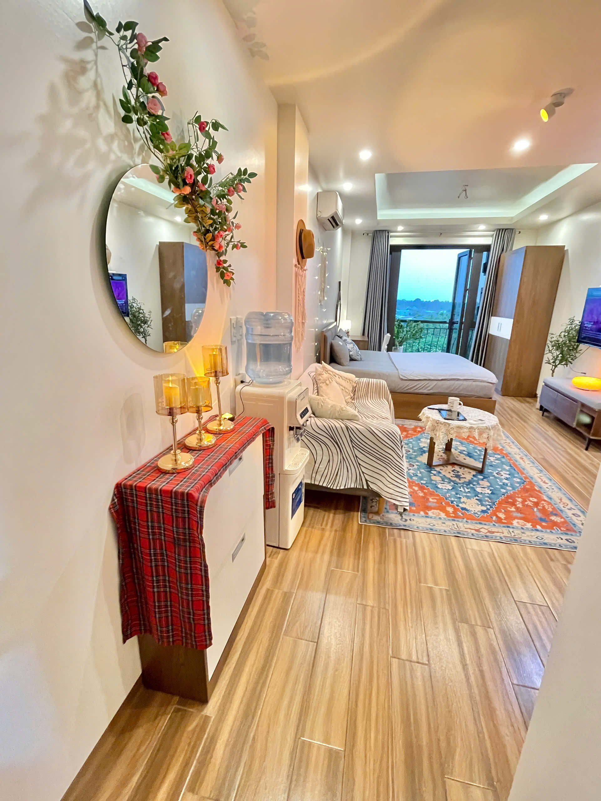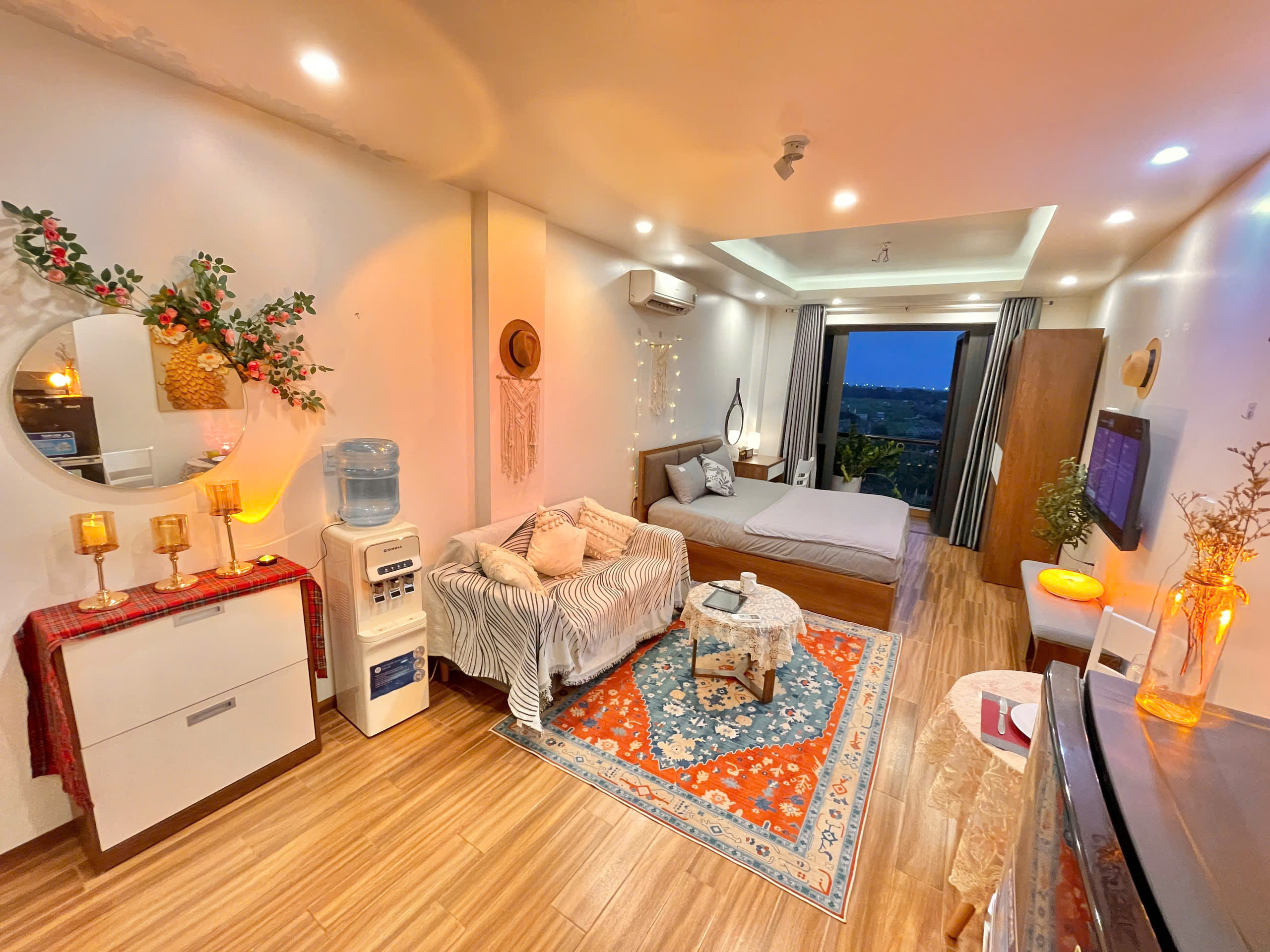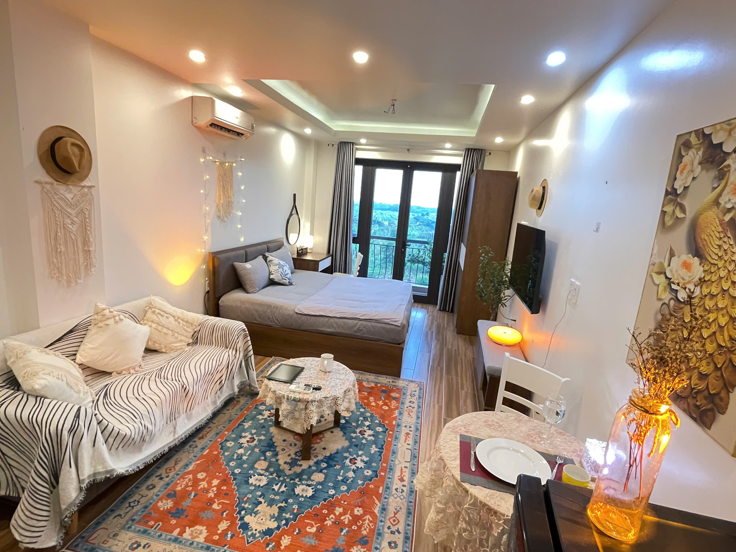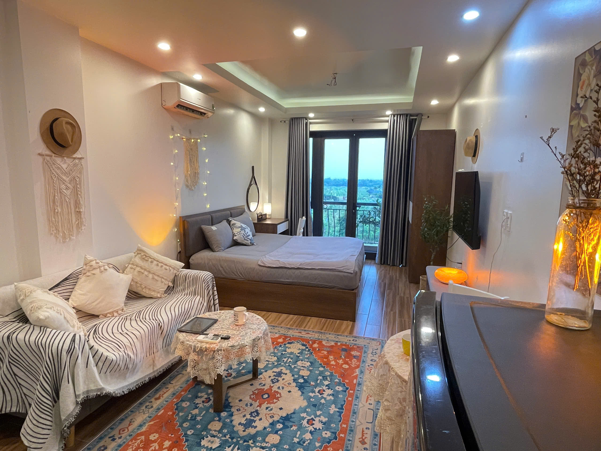 Căn hộ còn được trang bị điều hòa không khí để đảm bảo sự mát mẻ trong mọi điều kiện thời tiết. Các chi tiết trang trí như gương tròn lớn, cây xanh và đồ trang trí macrame tạo nên một không gian sống đầy tính nghệ thuật và ấm cúng.