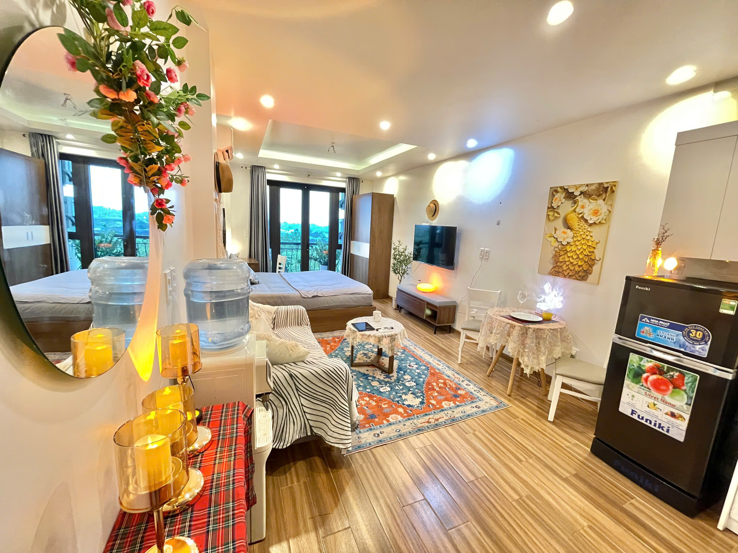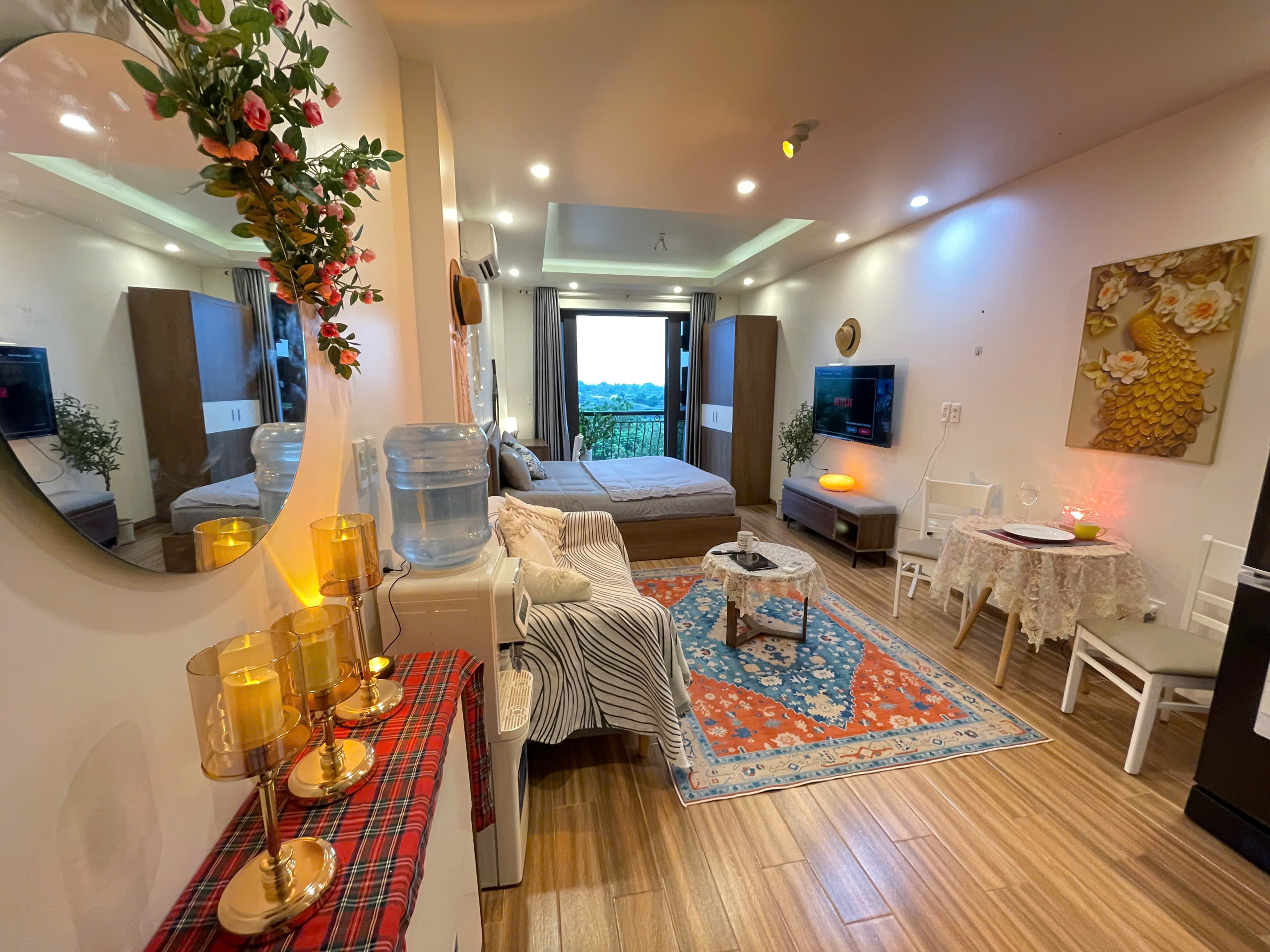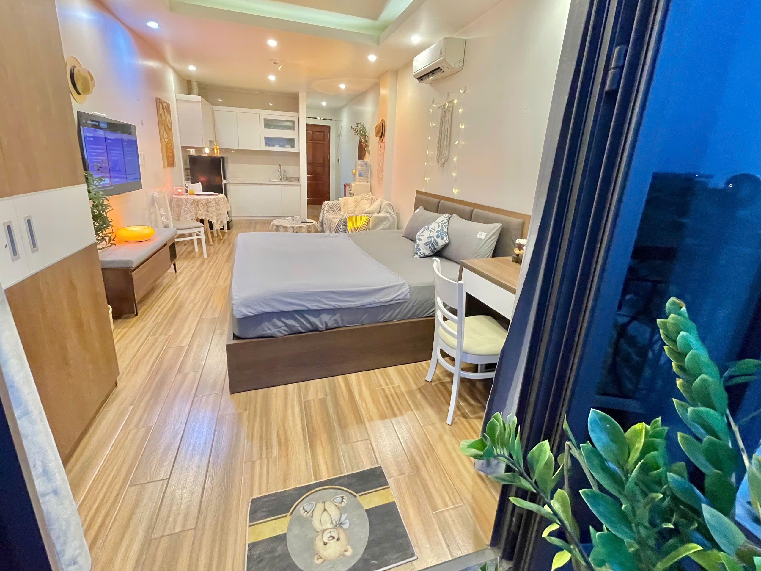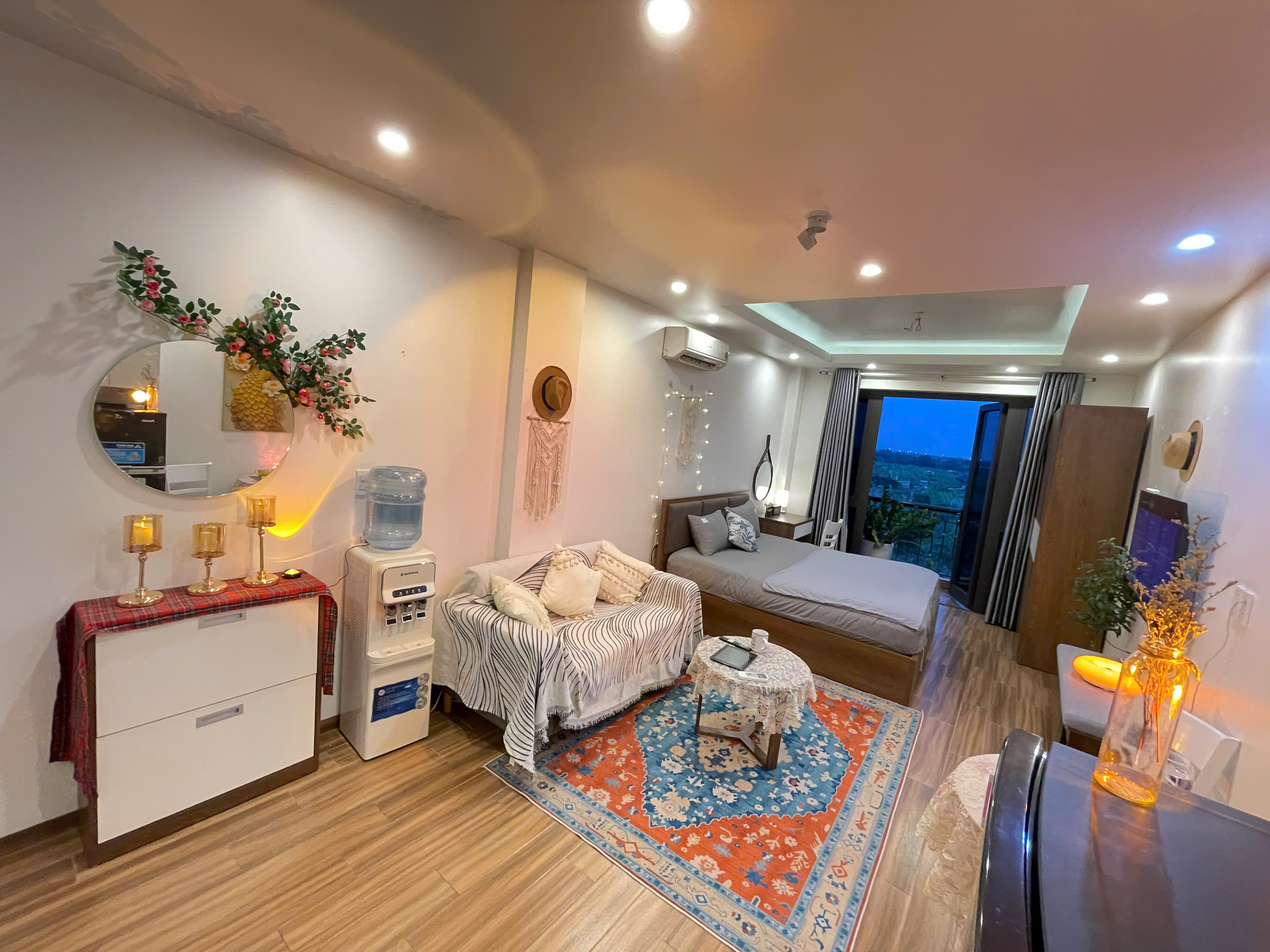 Căn hộ còn được trang bị điều hòa không khí để đảm bảo sự mát mẻ trong mọi điều kiện thời tiết. Các chi tiết trang trí như gương tròn lớn, cây xanh và đồ trang trí macrame tạo nên một không gian sống đầy tính nghệ thuật và ấm cúng.