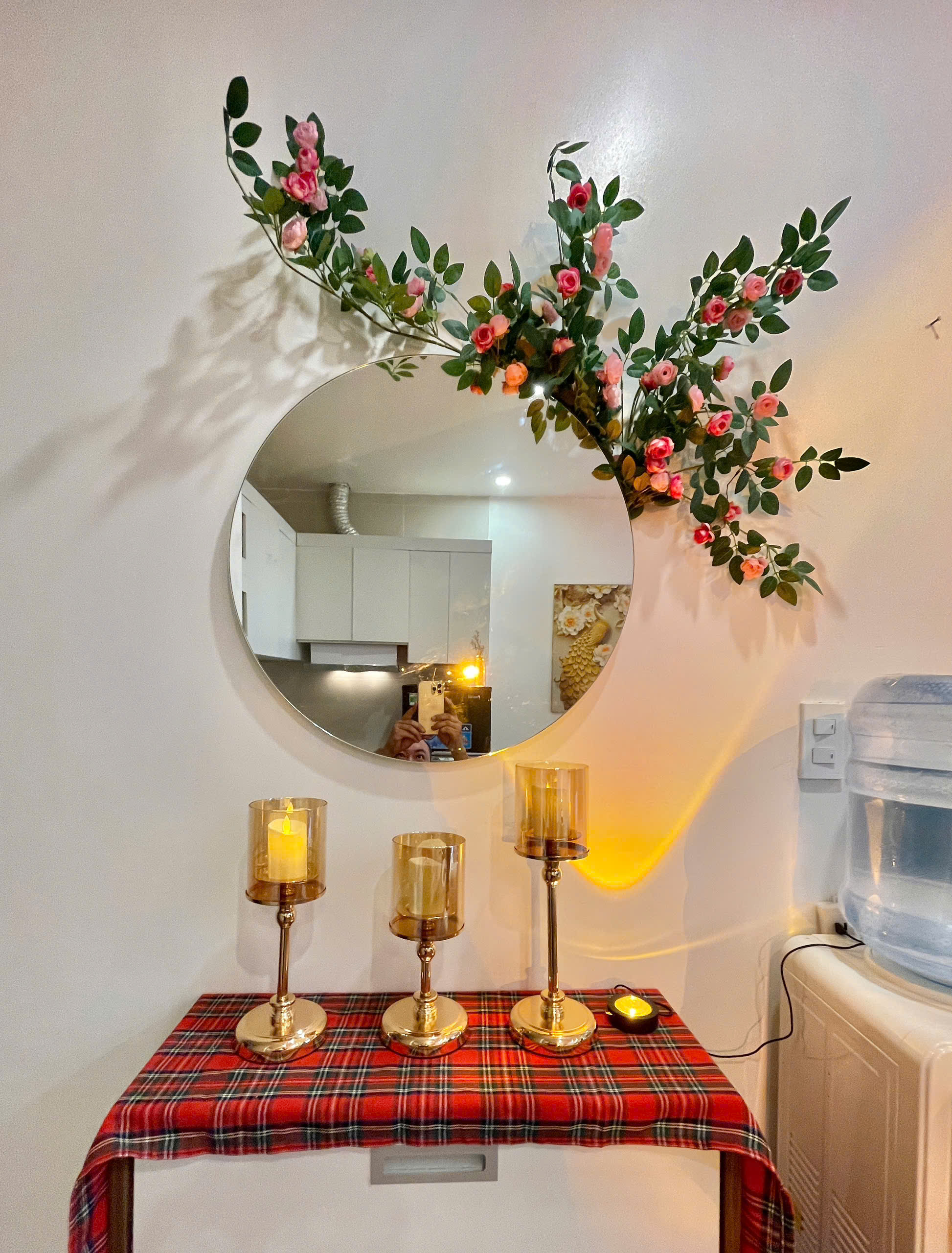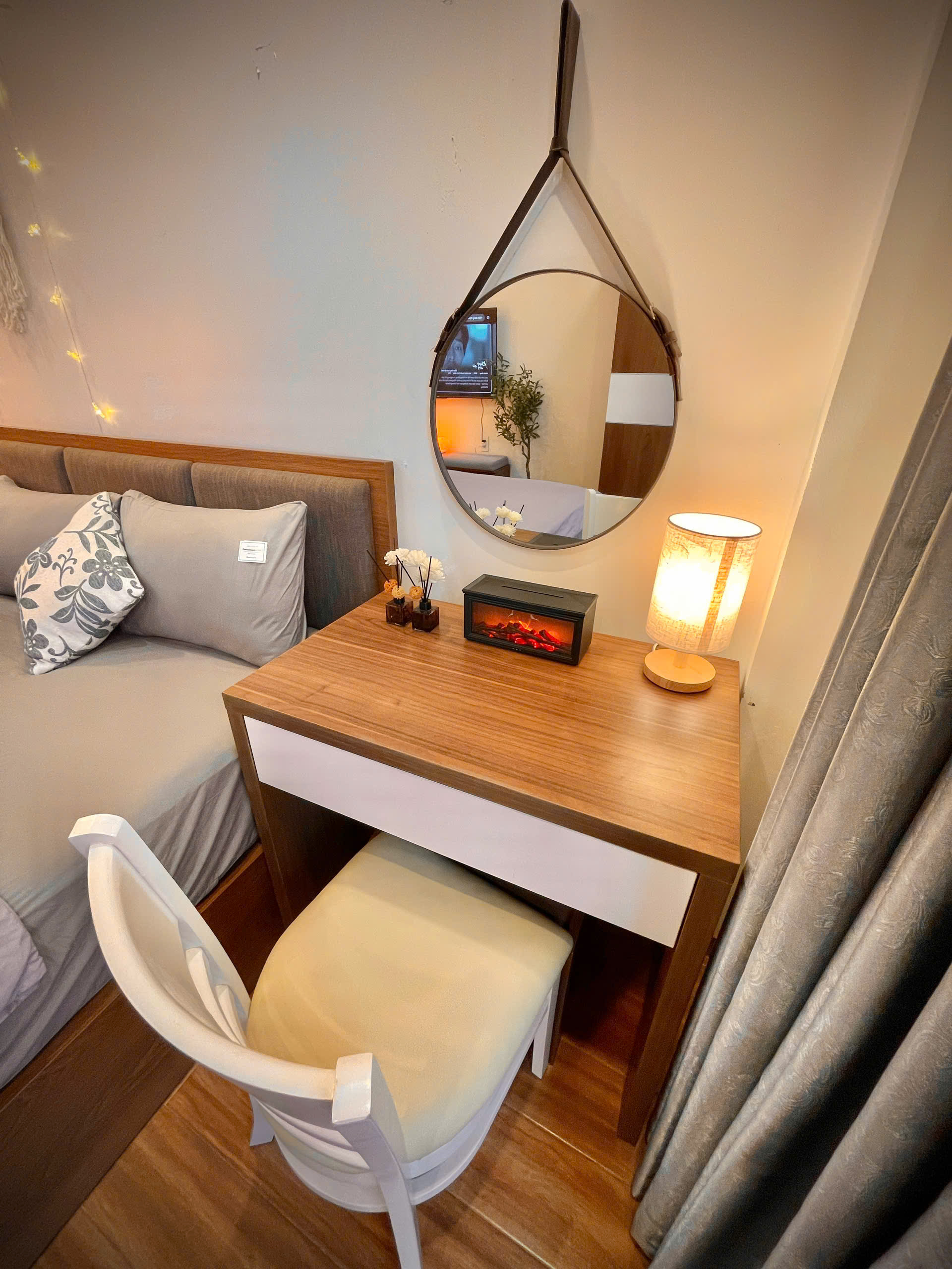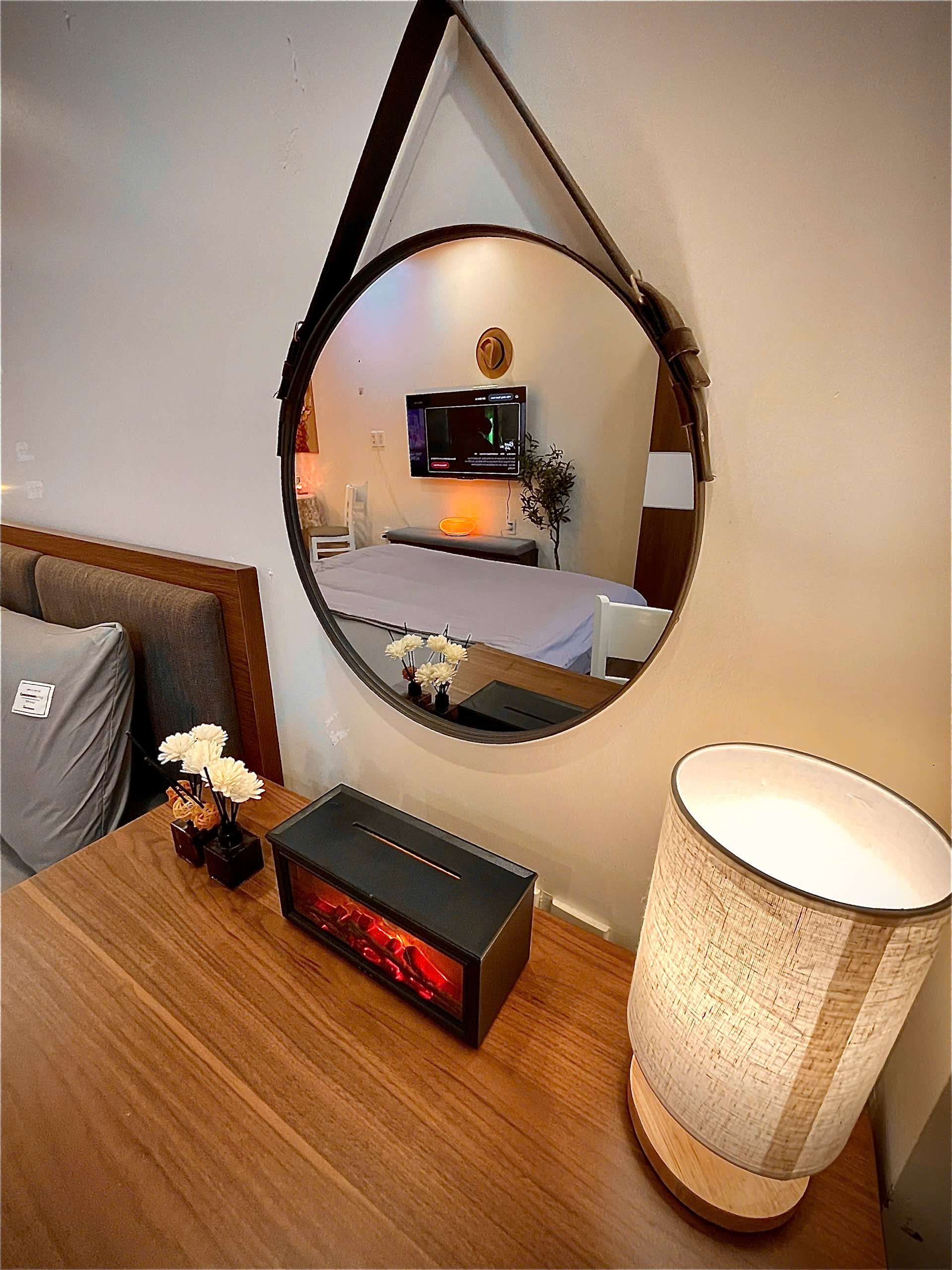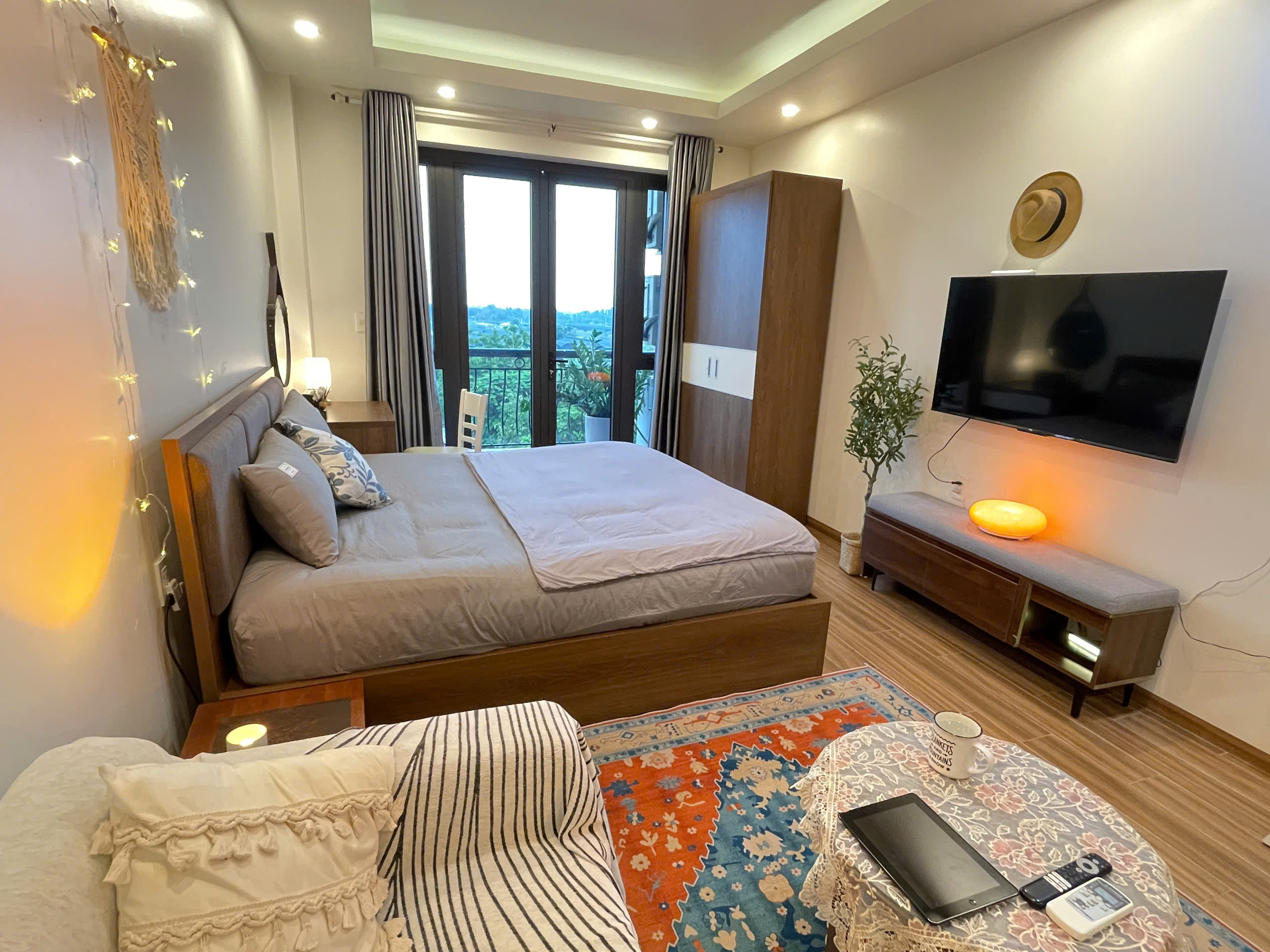 Căn hộ còn được trang bị điều hòa không khí để đảm bảo sự mát mẻ trong mọi điều kiện thời tiết. Các chi tiết trang trí như gương tròn lớn, cây xanh và đồ trang trí macrame tạo nên một không gian sống đầy tính nghệ thuật và ấm cúng.