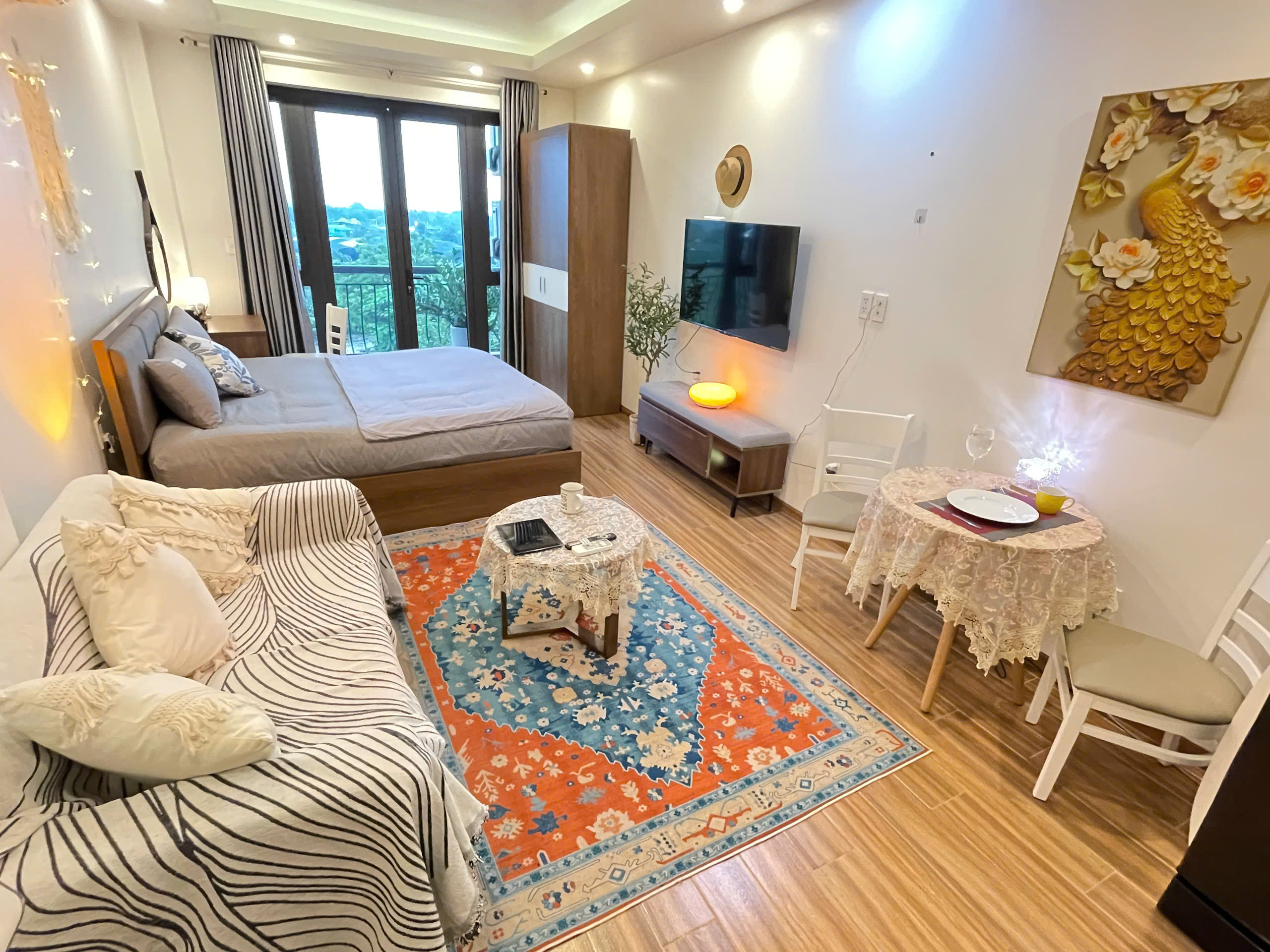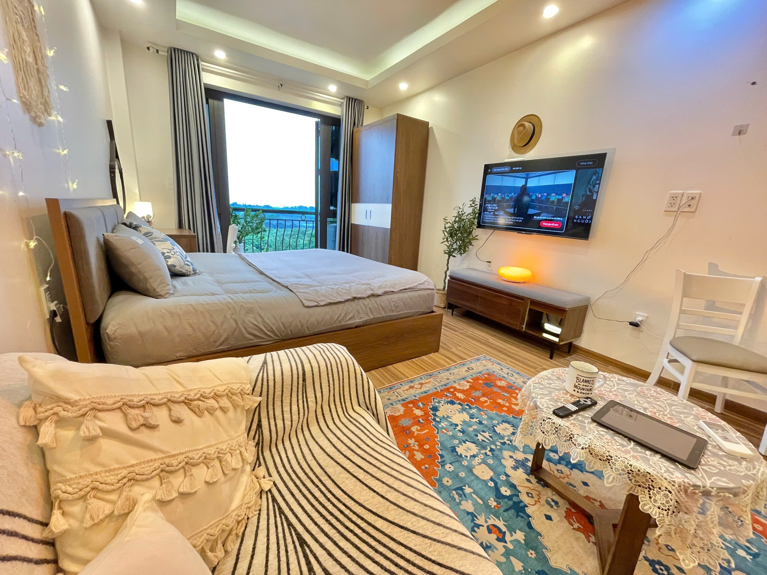 Không gian sinh hoạt chung được bố trí thông minh, với ghế sofa êm ái được phủ khăn họa tiết, cùng bàn trà nhỏ và thảm trải sàn hoa văn độc đáo, tạo nên một góc thư giãn ấm cúng. Khu vực giải trí được trang bị