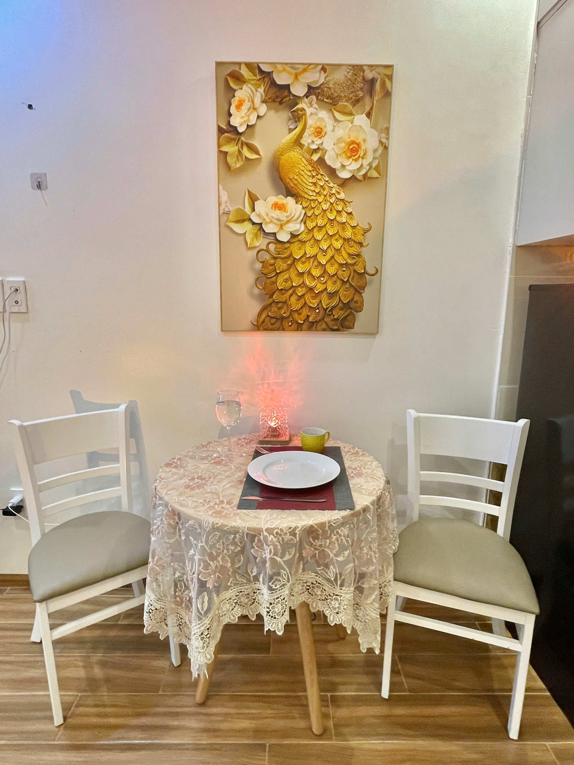 TV màn hình phẳng lớn treo tường, sẵn sàng phục vụ mọi nhu cầu giải trí của bạn. Đối diện là khu vực ăn uống với bàn tròn và ghế, nơi bạn có thể thưởng thức bữa ăn ngon.