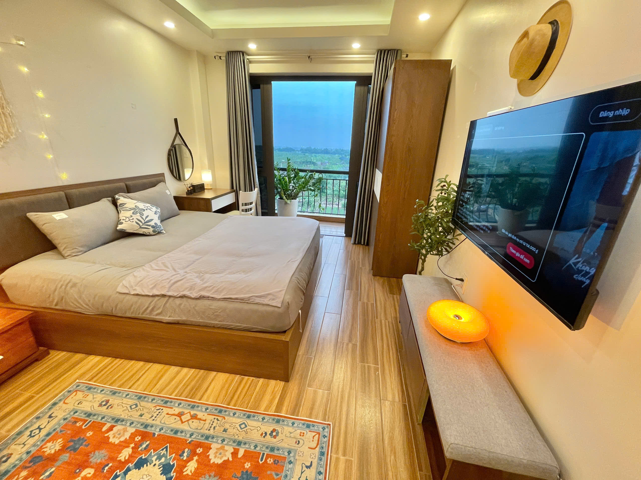 Điểm đặc biệt và nổi bật nhất của căn hộ chính là ban công panorama rộng rãi, mở ra tầm nhìn xanh mướt ra vườn cây trải dài hết tầm mắt. Phía xa hơn, bạn sẽ thấy sông Hồng uốn lượn và đặc biệt là cầu Nhật Tân lung linh ánh đèn vào ban đêm, tạo nên một khung cảnh vô cùng lãng mạn và thơ mộng. Ban công là nơi lý tưởng để bạn tận hưởng không khí trong lành, ngắm bình minh hay thư giãn dưới ánh hoàng hôn tuyệt đẹp.