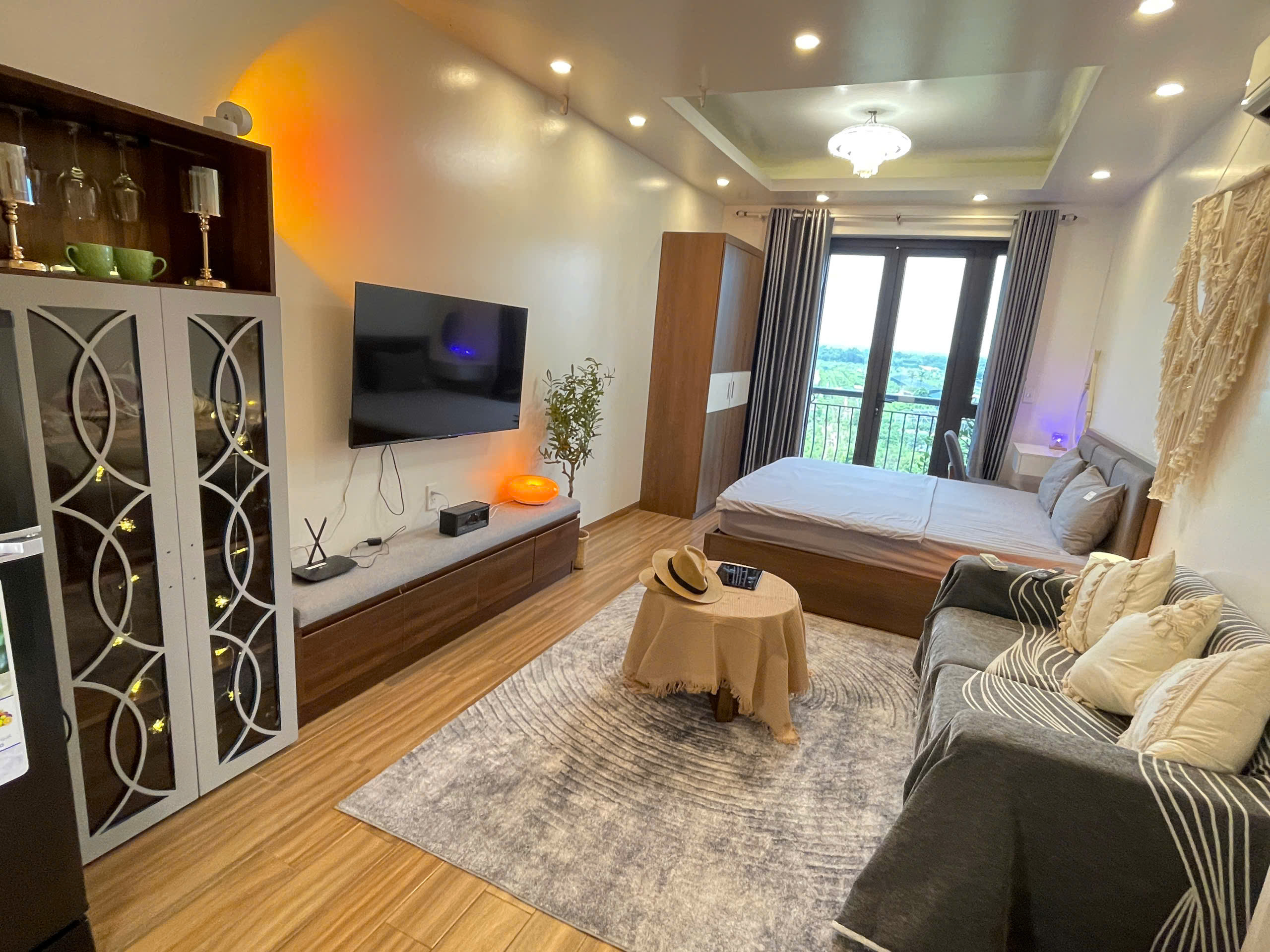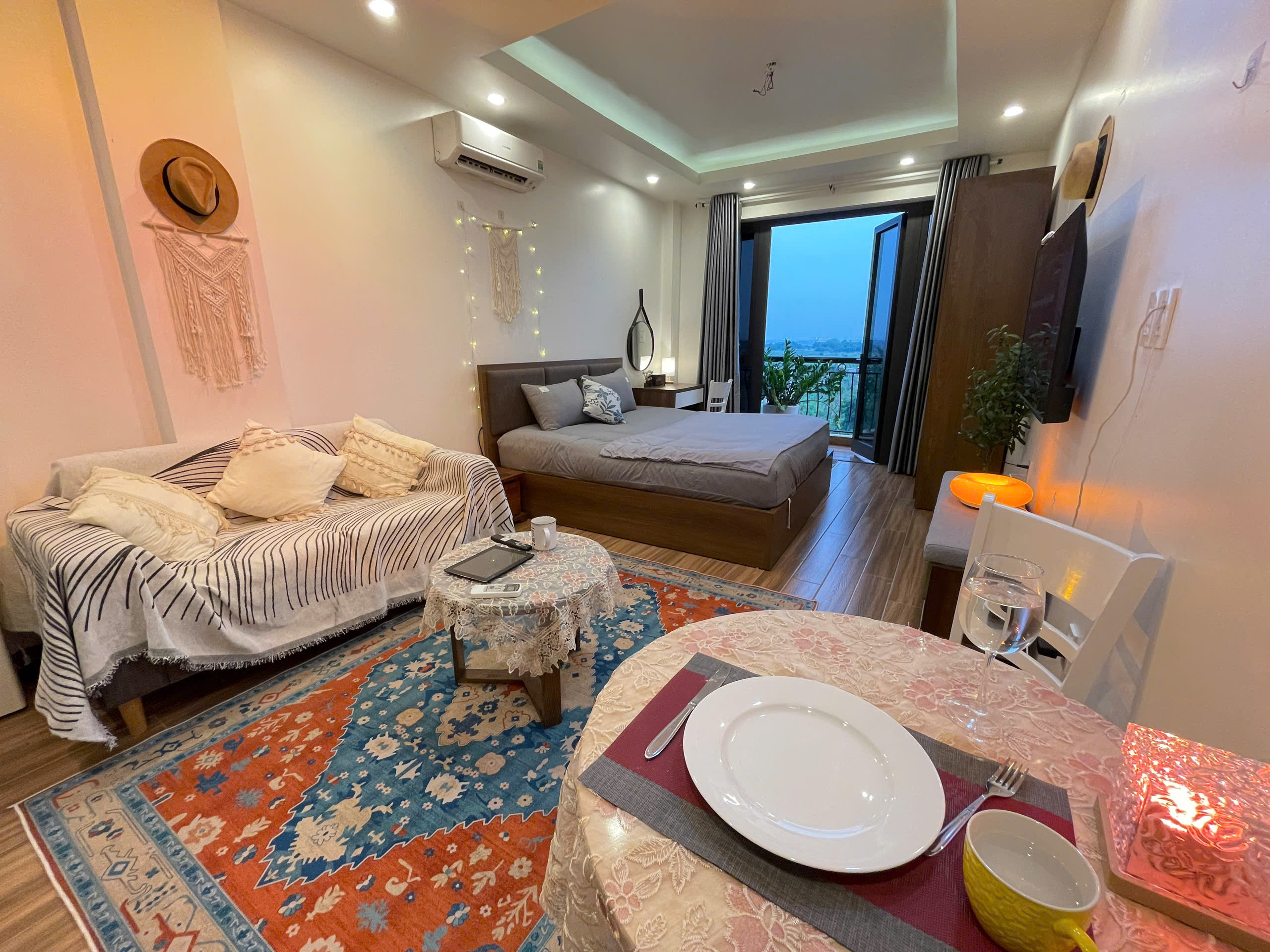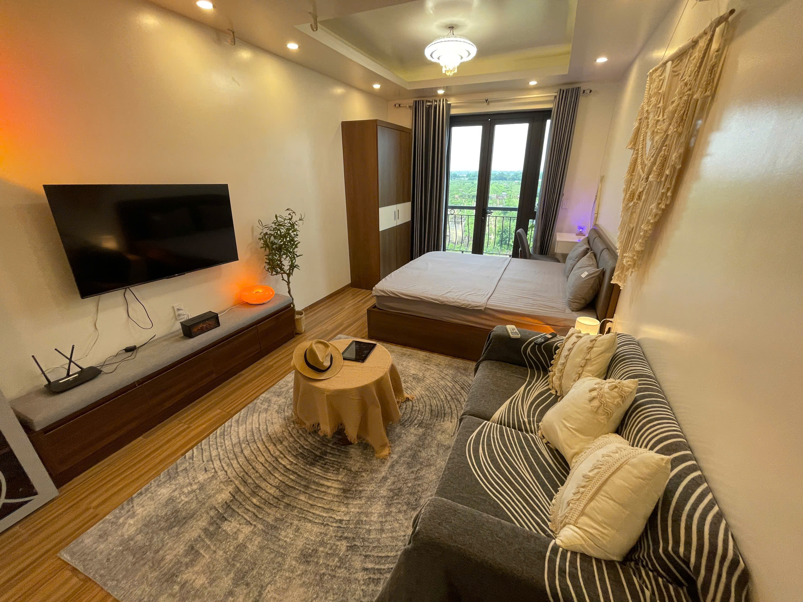 Không gian sinh hoạt được tối ưu hóa với TV màn hình phẳng lớn treo tường, cùng một chiếc ghế bành màu nâu đỏ thoải mái, tạo nên một góc thư giãn lý tưởng. Bạn có thể thưởng thức ly cà phê sáng tại bàn ăn nhỏ xinh với hai ghế, hoặc ra ban công riêng để tận hưởng không khí trong lành và ngắm nhìn quang cảnh xung quanh. Ban công không chỉ mang lại ánh sáng tự nhiên mà còn là nơi lý tưởng để hít thở khí trời và cảm nhận nhịp sống của Hà Nội.