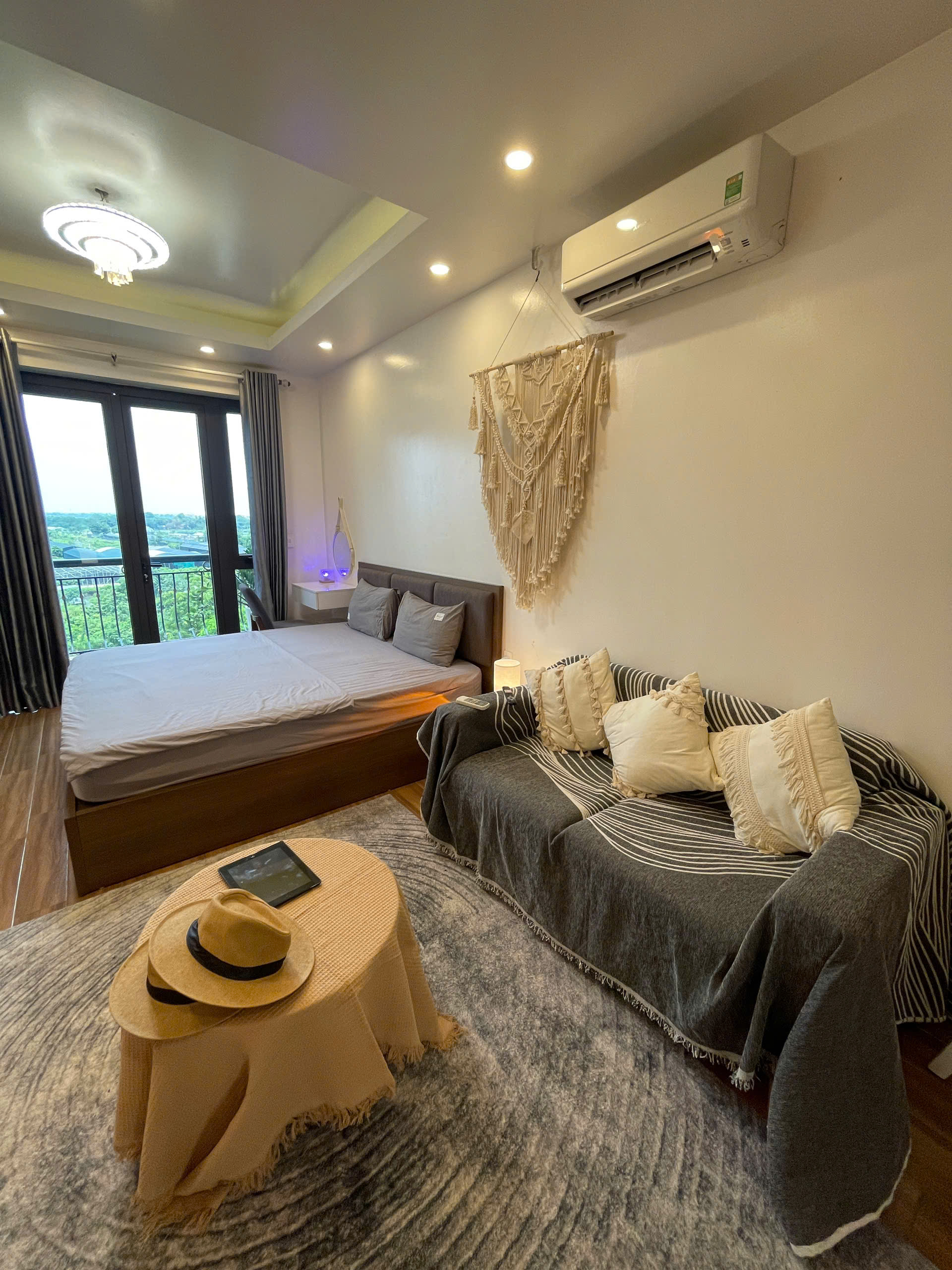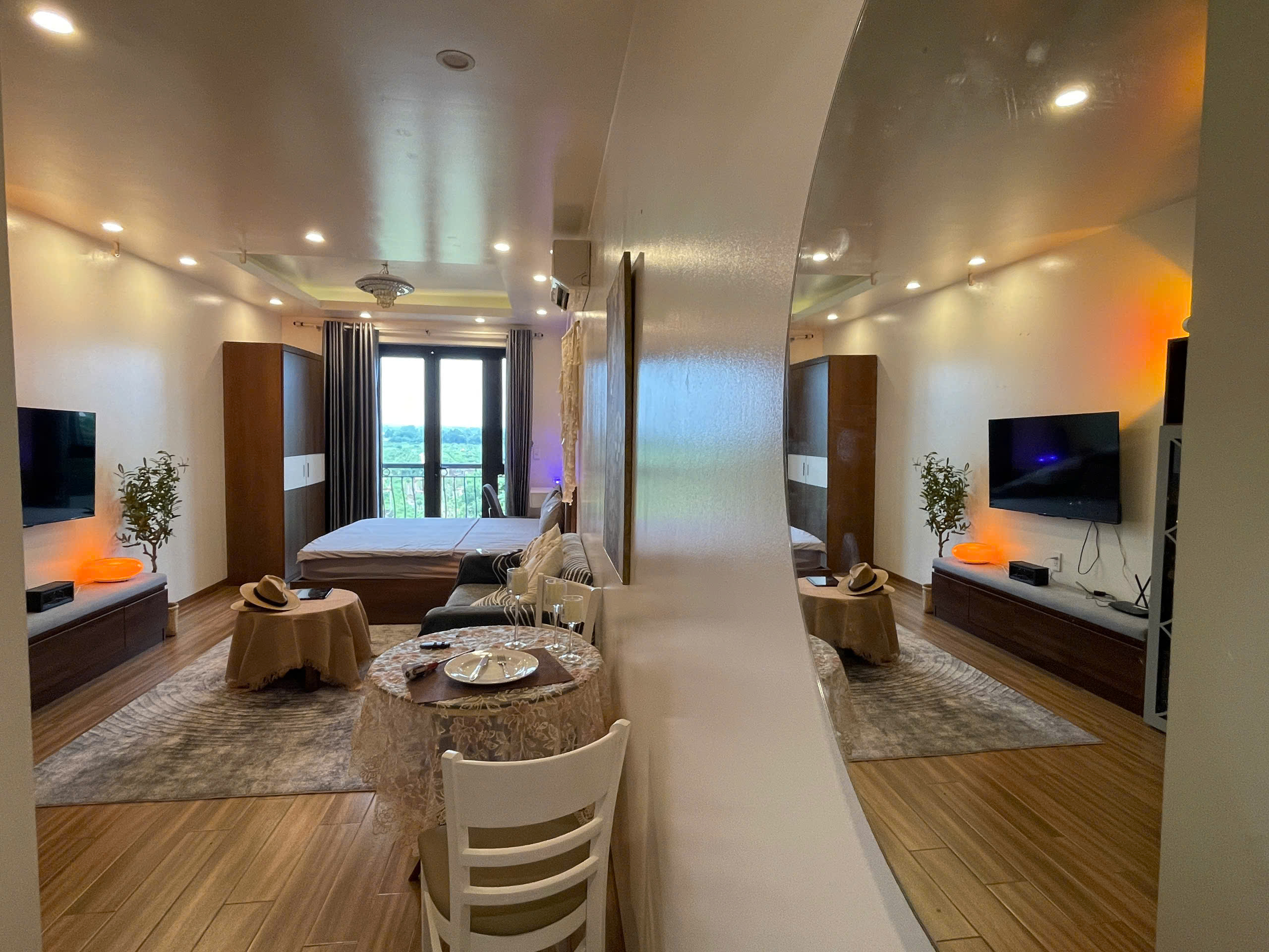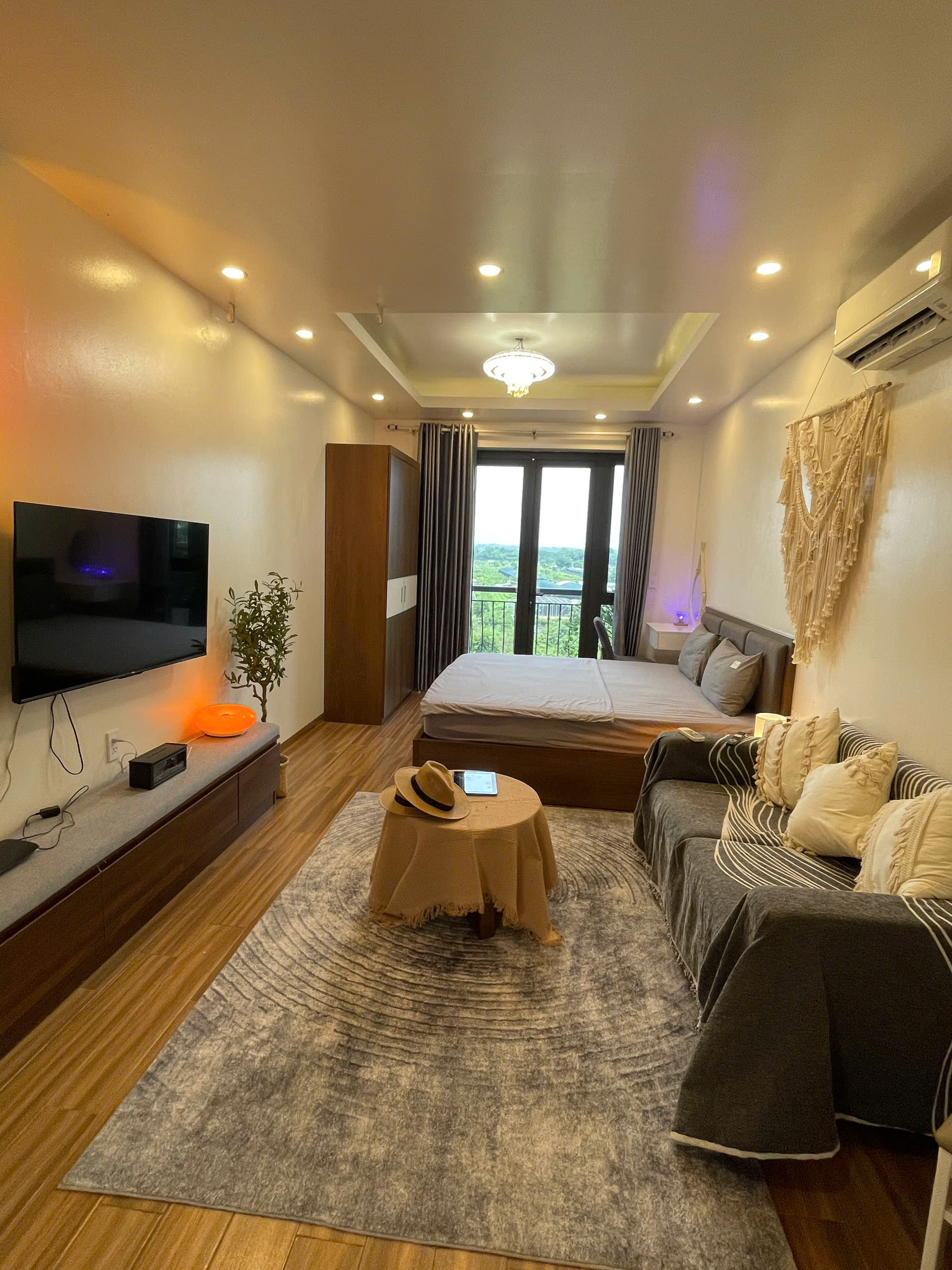 Không gian sinh hoạt được tối ưu hóa với TV màn hình phẳng lớn treo tường, cùng một chiếc ghế bành màu nâu đỏ thoải mái, tạo nên một góc thư giãn lý tưởng. Bạn có thể thưởng thức ly cà phê sáng tại bàn ăn nhỏ xinh với hai ghế, hoặc ra ban công riêng để tận hưởng không khí trong lành và ngắm nhìn quang cảnh xung quanh. Ban công không chỉ mang lại ánh sáng tự nhiên mà còn là nơi lý tưởng để hít thở khí trời và cảm nhận nhịp sống của Hà Nội.
