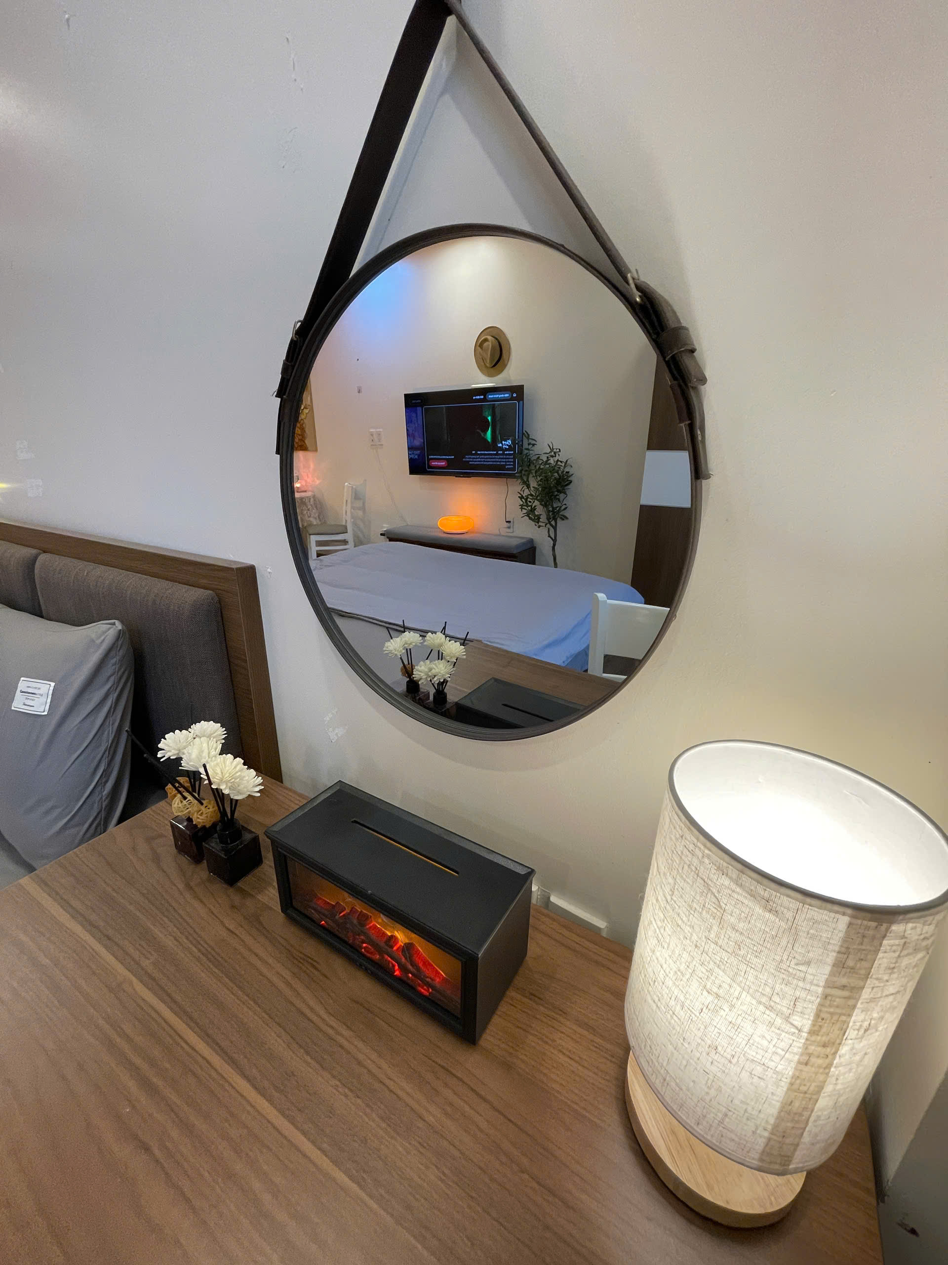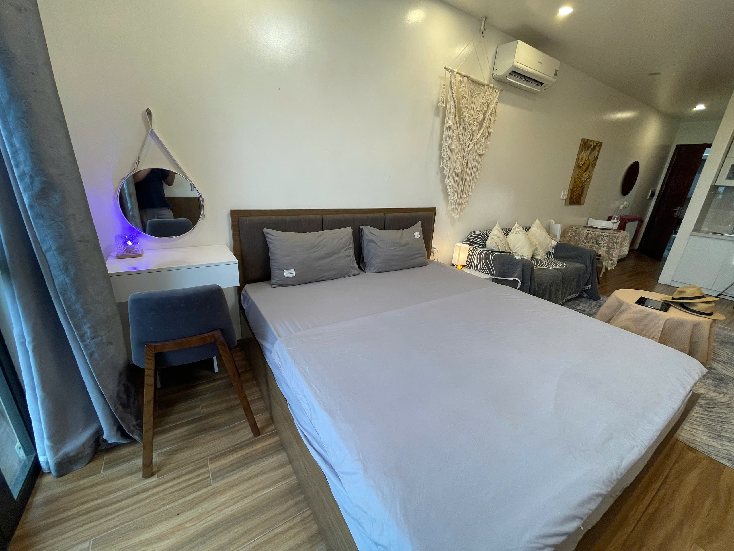 Khi bước vào căn hộ, bạn sẽ cảm nhận ngay sự thoải mái từ không gian được bố trí hợp lý. Giường đôi êm ái với bộ ga trải trắng tinh khôi là nơi lý tưởng để bạn nghỉ ngơi sau một ngày dài khám phá thành phố. Bên cạnh giường là tủ đầu giường nhỏ gọn, tiện lợi để đặt các vật dụng cá nhân.