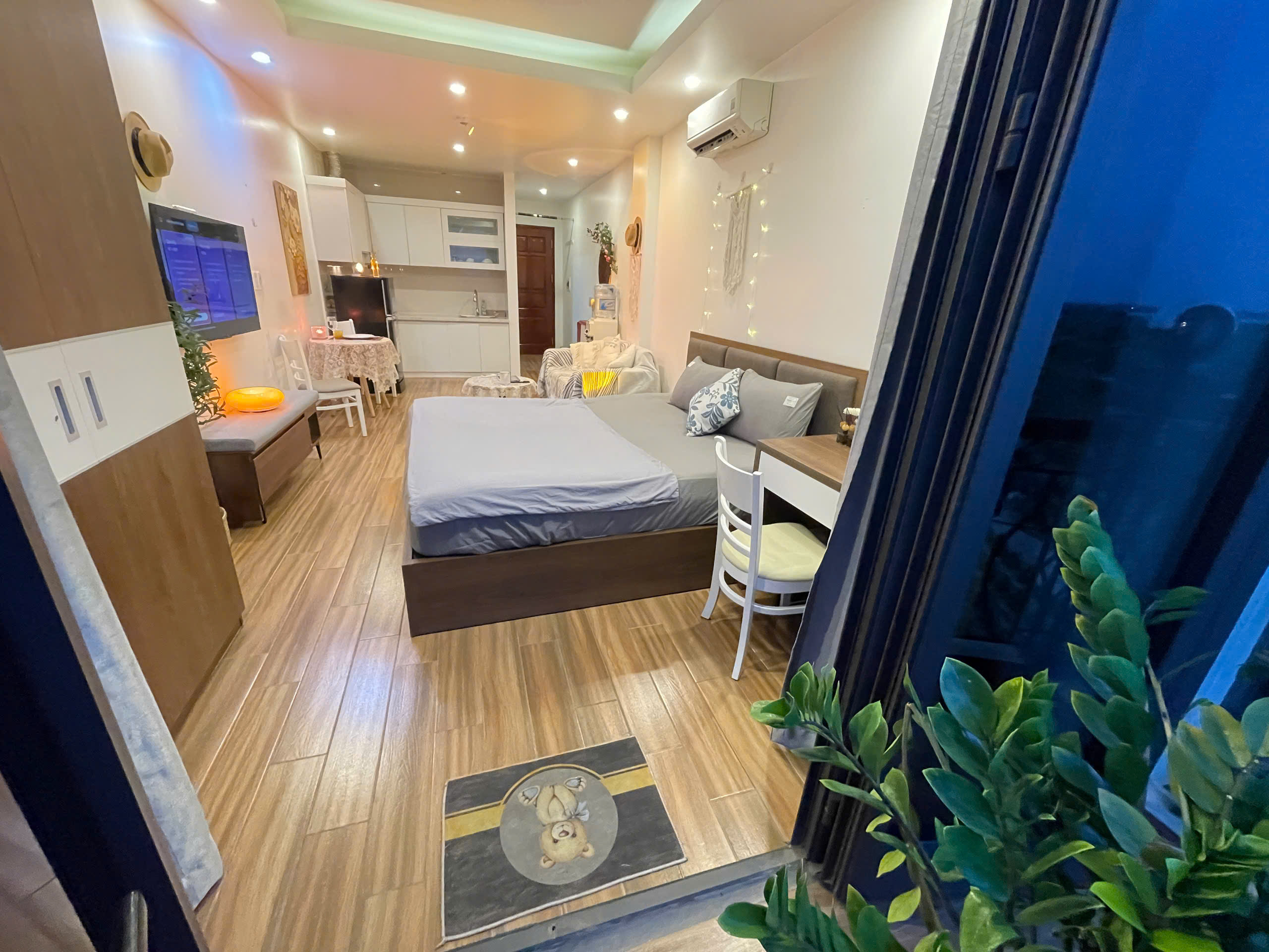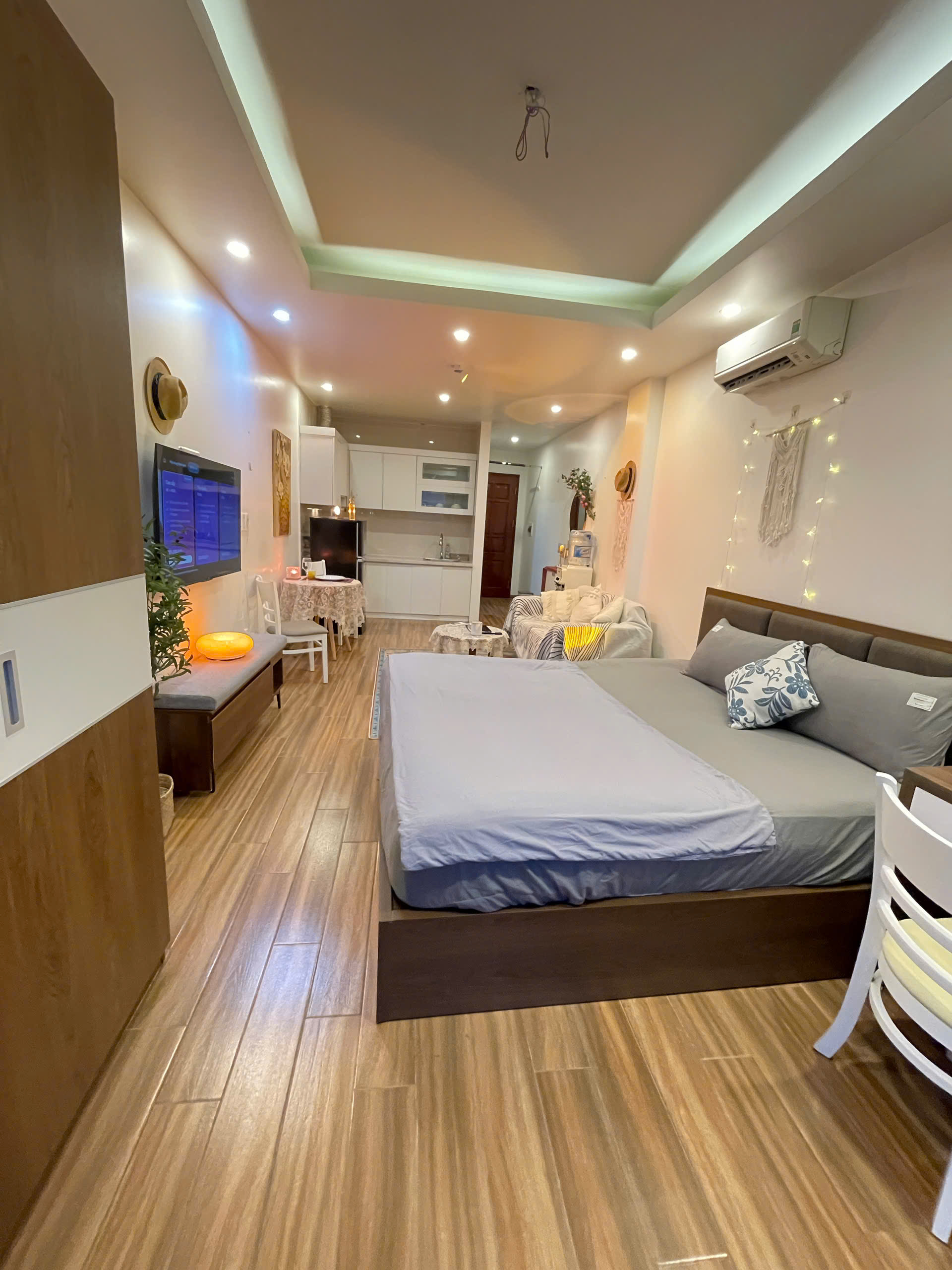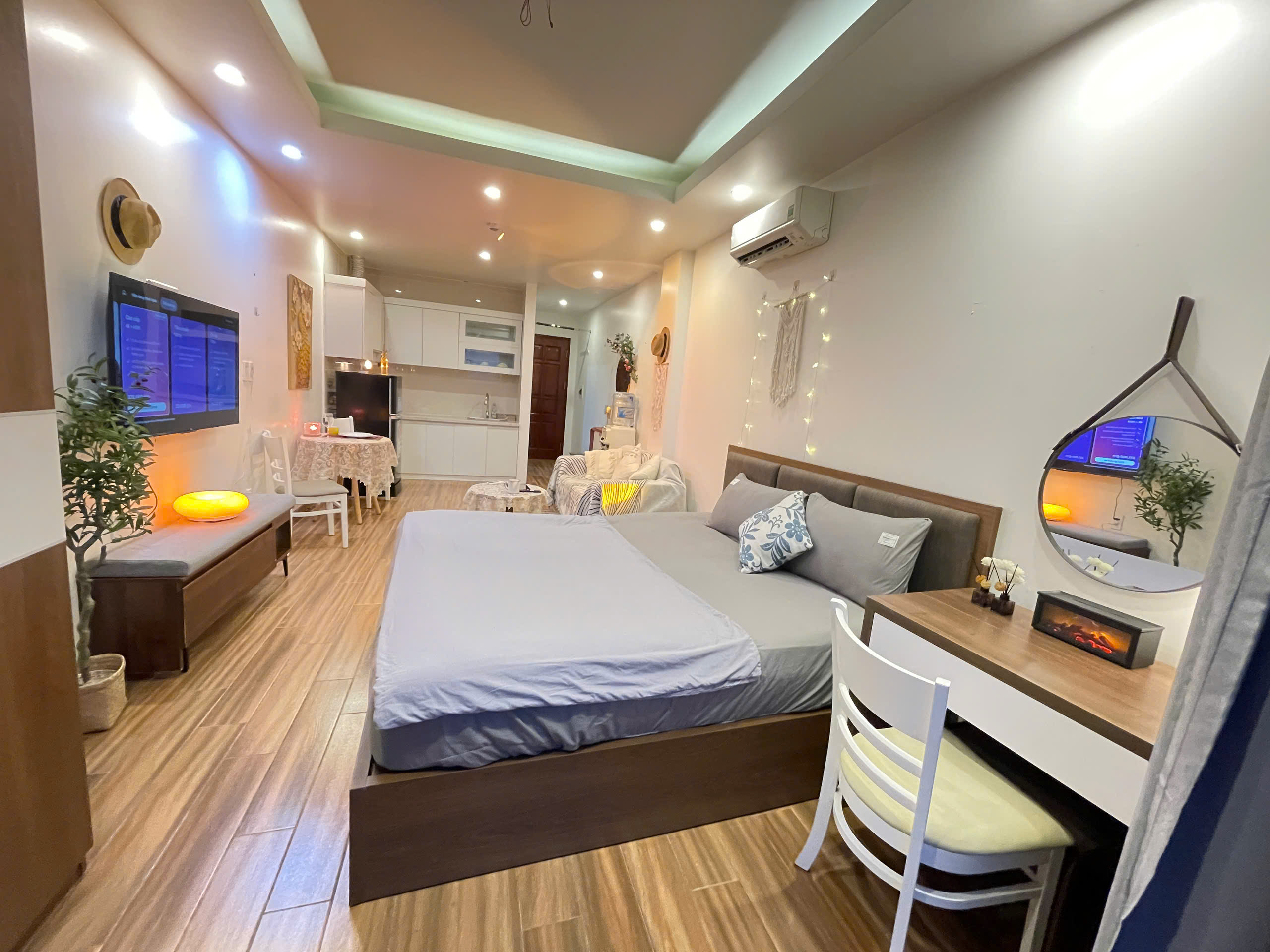 Căn hộ còn được trang bị bếp nhỏ gọn với các tiện ích cơ bản như bếp từ và tủ lạnh mini, đủ để bạn chuẩn bị những bữa ăn nhẹ. Phòng tắm riêng biệt được thiết kế hiện đại với vòi sen tắm mưa và đầy đủ tiện nghi, đảm bảo sự thoải mái và riêng tư tối đa cho bạn.